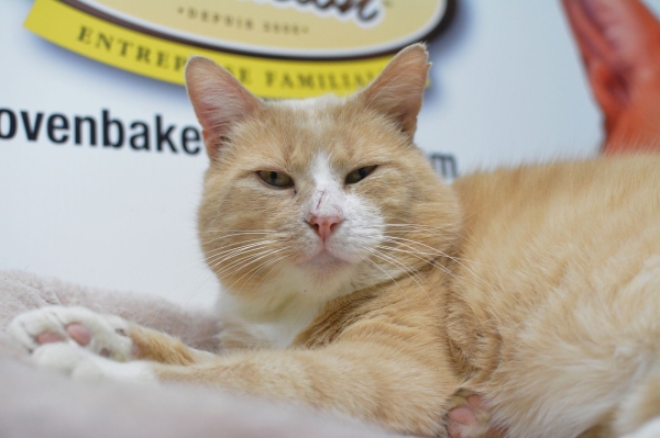 Aaron est un chat tellement gentil et doux. Il aime les humains et dès son premier jour avec nous il avait déjà conquis de nombreux coeurs. Il aime se prélasser dans son petit lit, mais ne dit pas non à un câlin quand on l’approche! Il nous montre même son ventre!