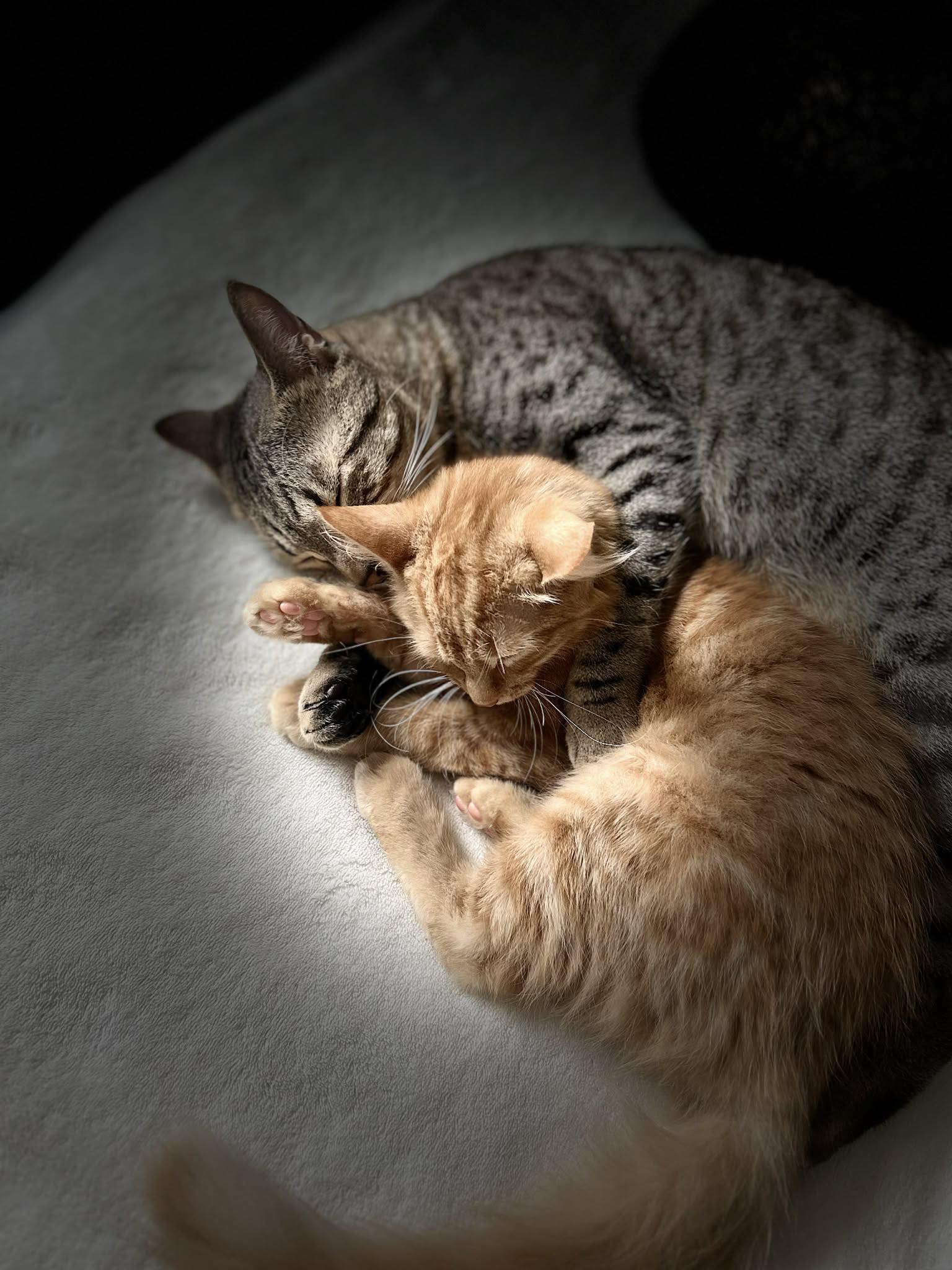 Côté tendresse, Akouna est une minette douce, affectueuse et remplie d’amour. Dans ses moments calmes, elle adore se coller et profiter des câlins. Elle se laisse flatter partout, même sur la bedaine, toujours avec délicatesse, jamais de griffes sorties. Et si elle préfère être tranquille, elle s’éloigne tout simplement. Akouna est unique et spéciale. Elle apportera douceur, joie et complicité à sa famille adoptive.