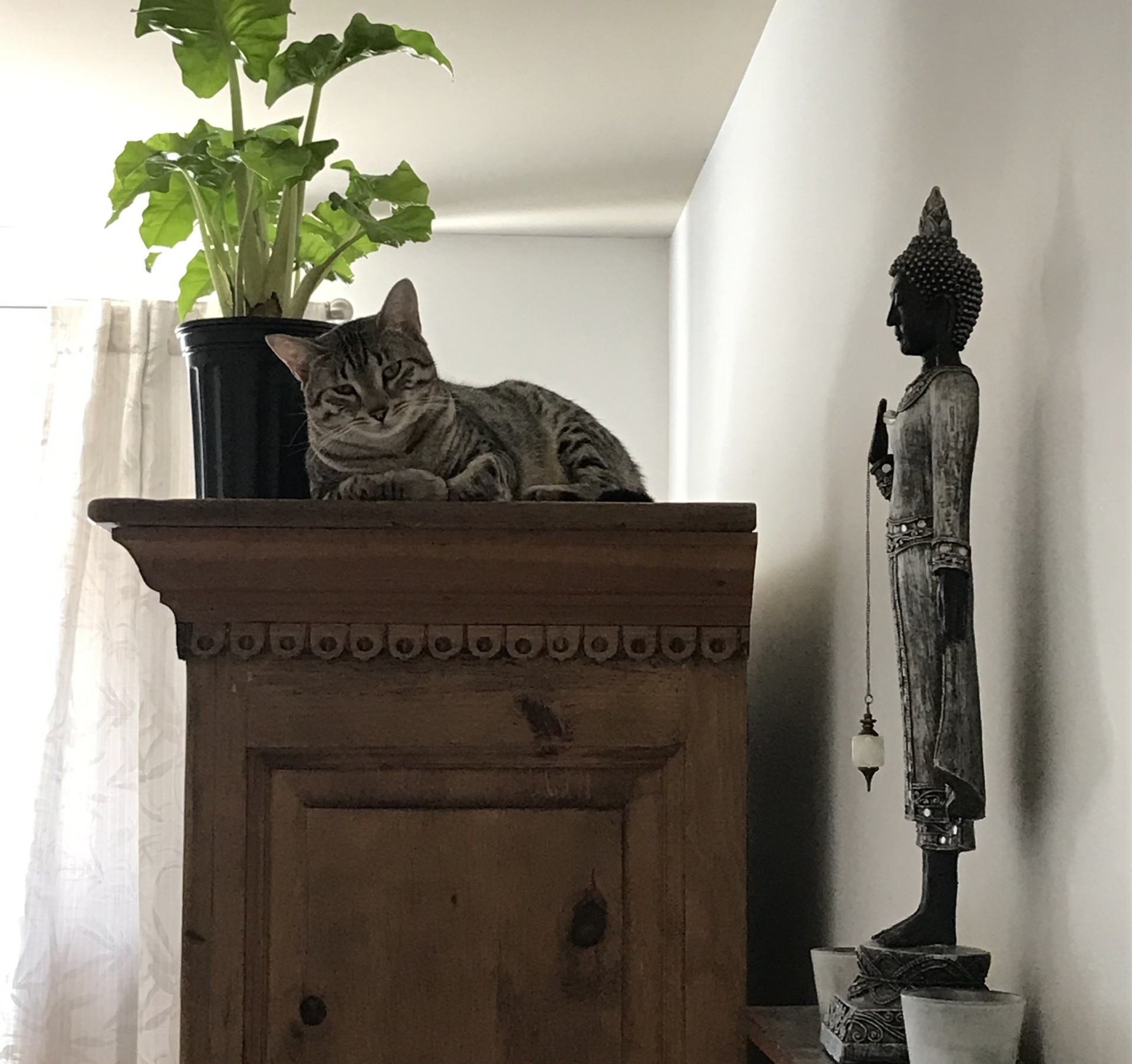 DODO : elle dort un peu partout : dans le lit, sur le bord des fenêtres, en haut du frigo ou dans un berceau réservé aux chats. La journée, elle préfère rester en hauteur.
