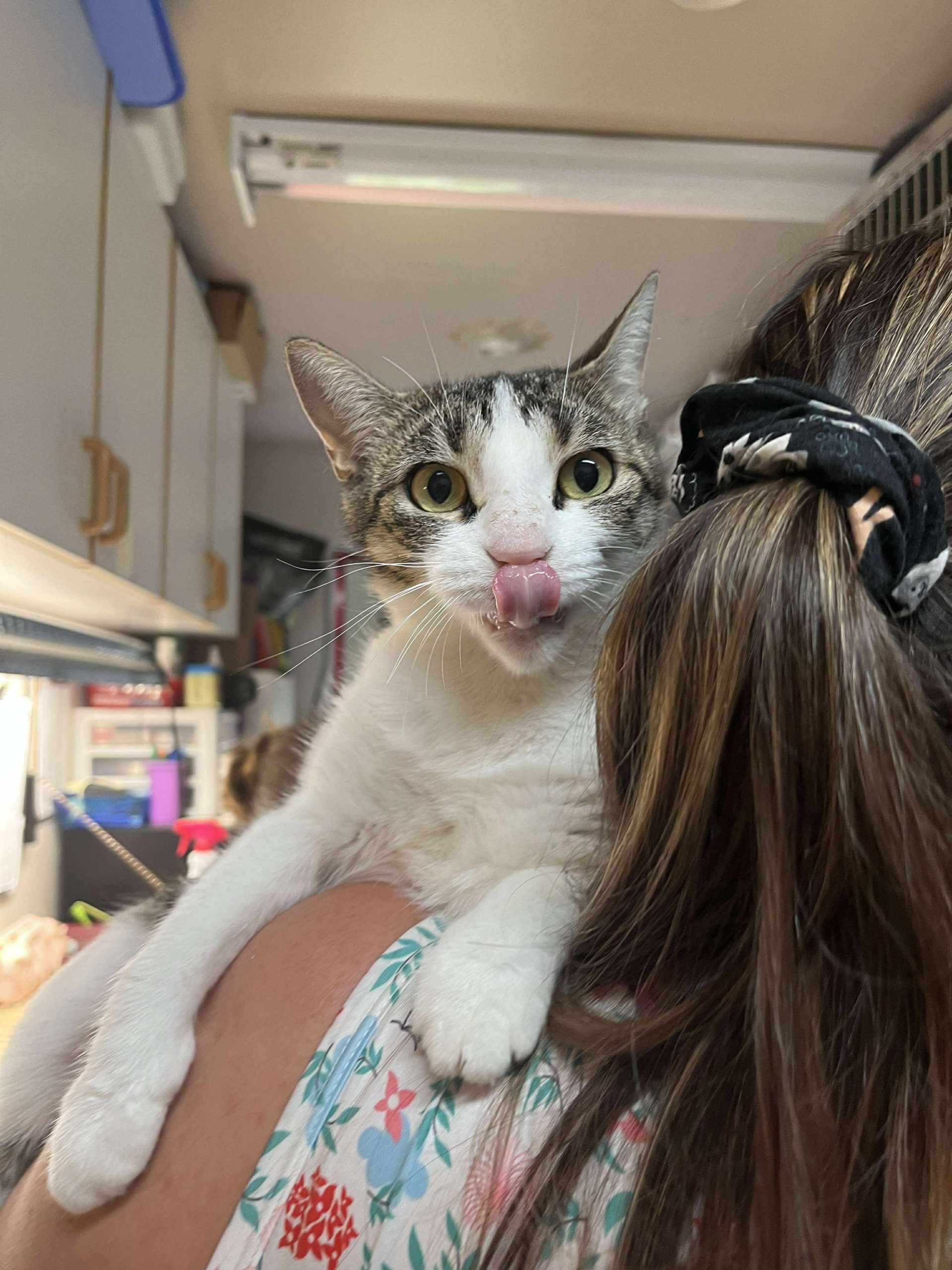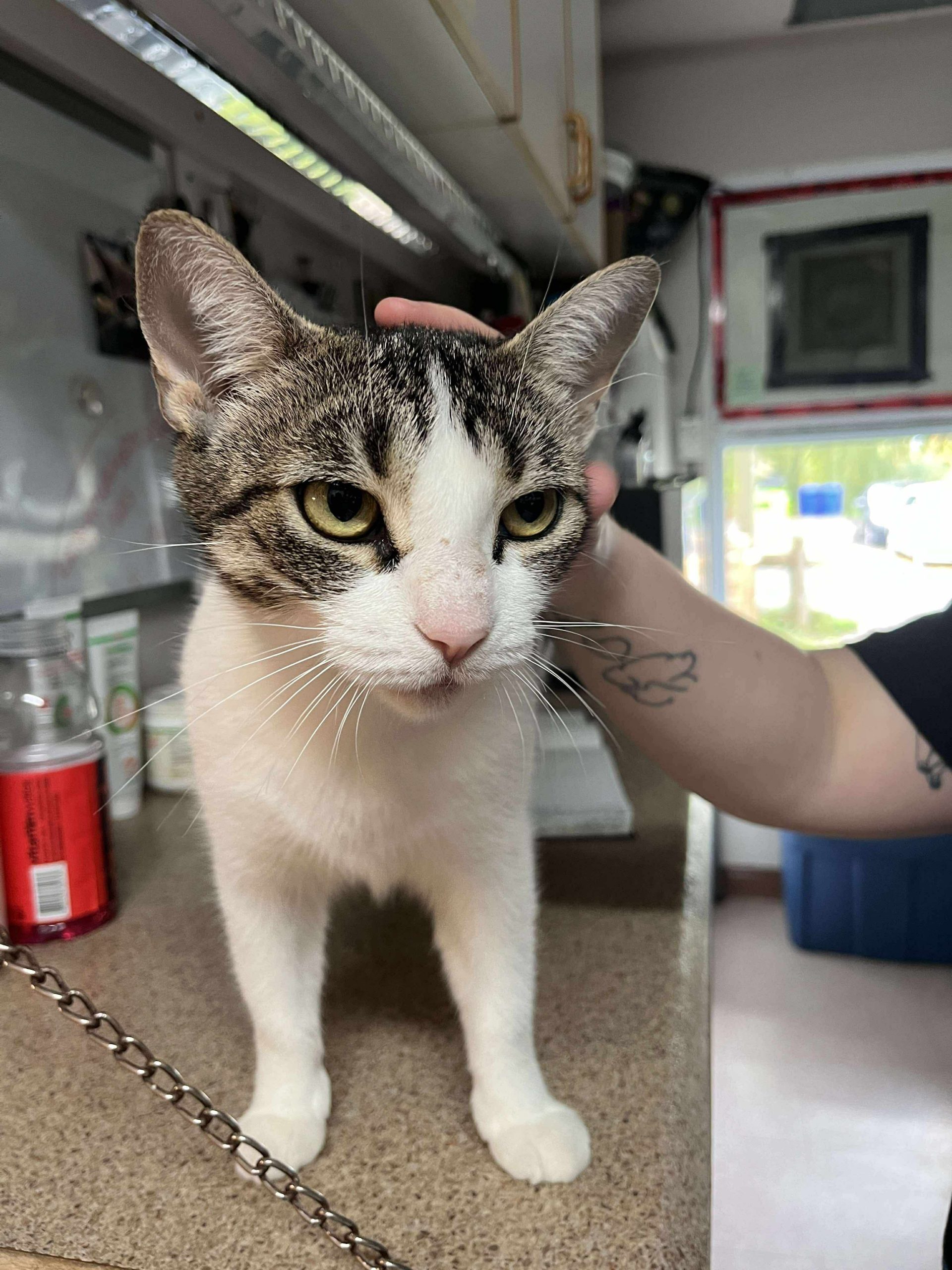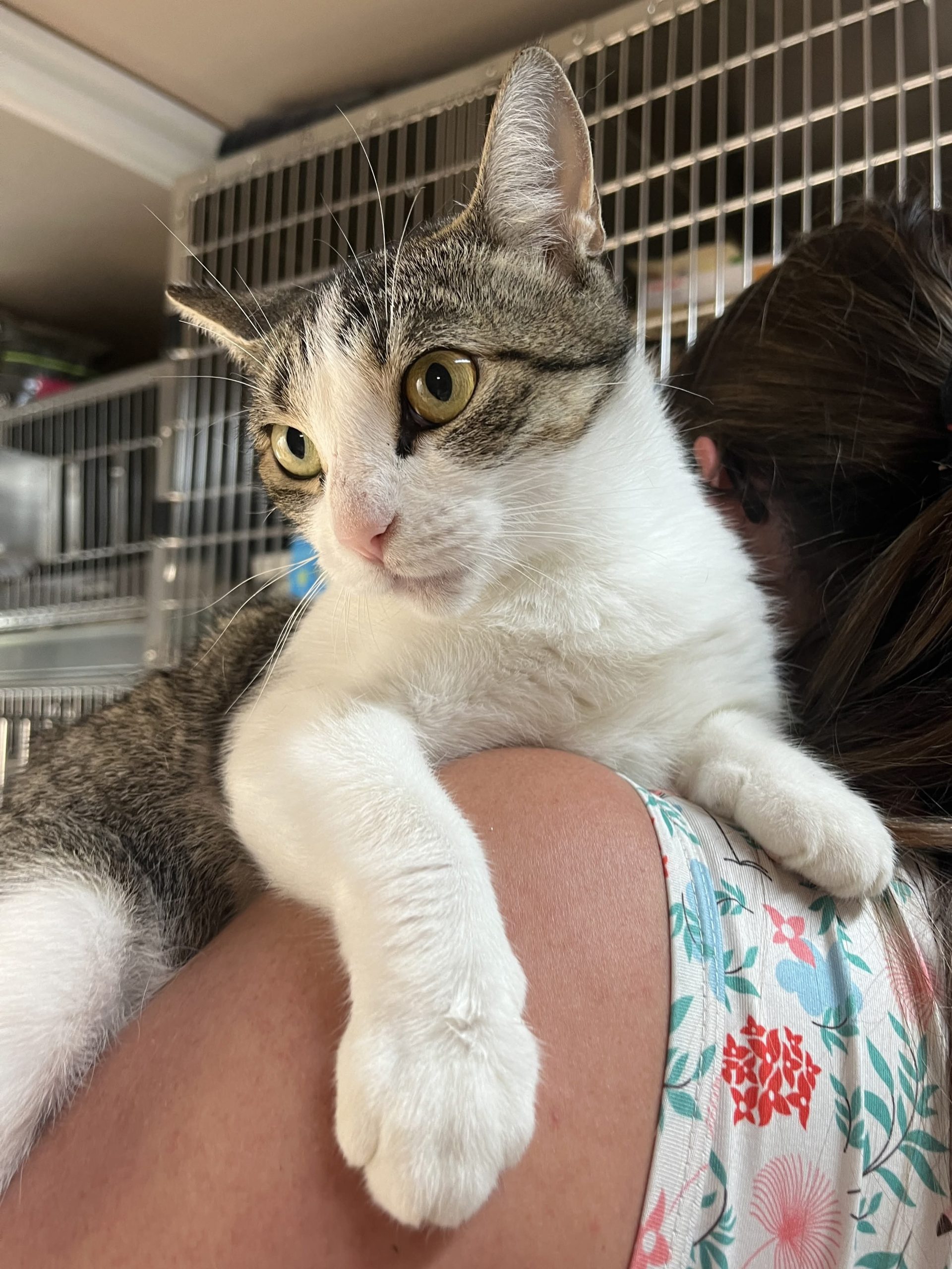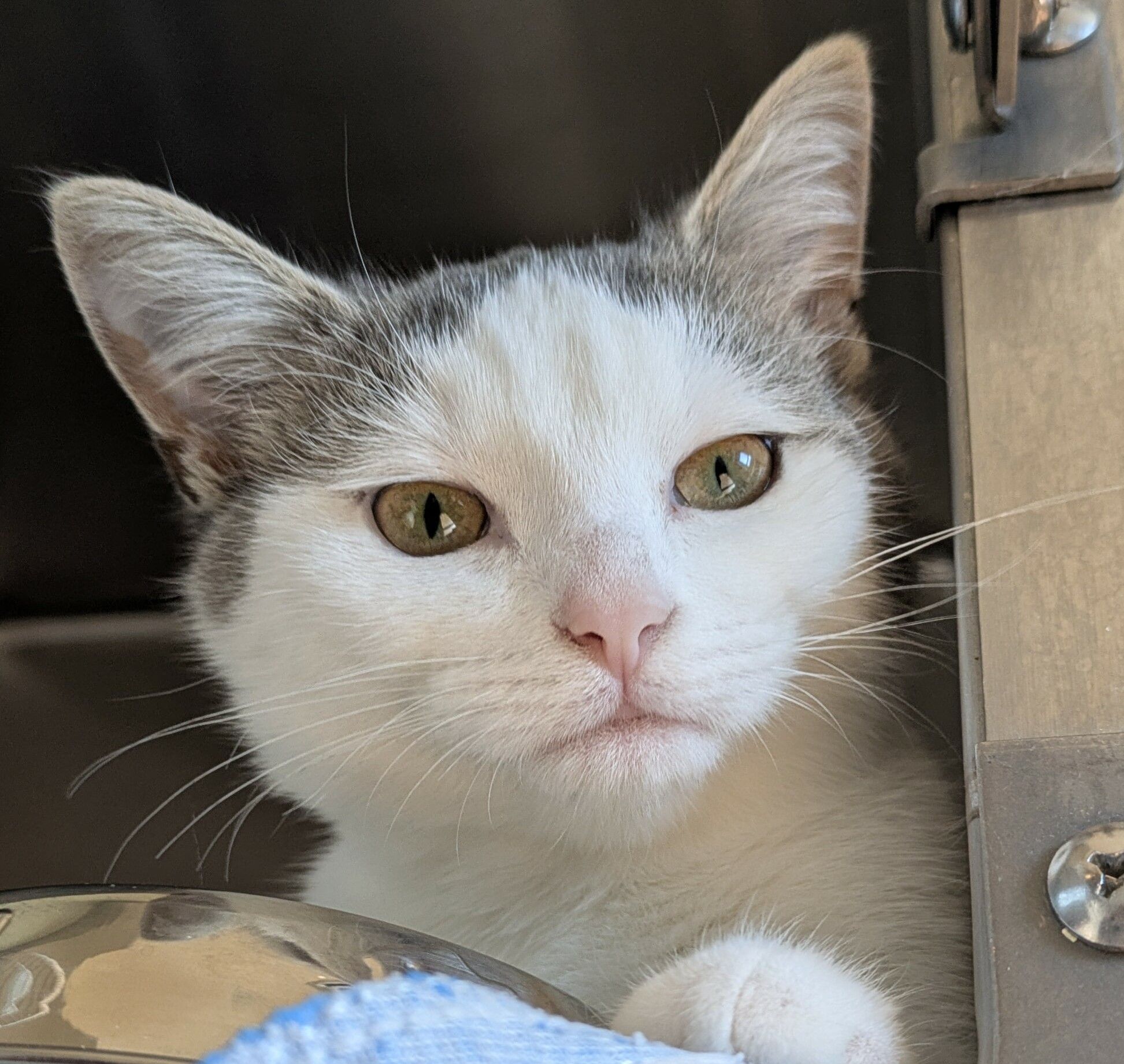 La belle Alice a été capturée sur le terrain au refuge le 10 septembre 2025. Elle avait été aperçue presqu’à chaque jour depuis la fin de l’automne 2024, venant manger et boire près de la réception. Une fois en sécurité dans sa cage, nous avons constaté qu’elle avait des montées de lait. L’équipe s’est alors mise à la recherche de chatons laissés à l’extérieur. Deux chatons ont heureusement été sauvés pas longtemps après – ils sont aussitôt partis en famille d’accueil (étant assez vieux et sevrés) et la gentille Alice est restée au refuge pour des soins. La pauvre maman était plutôt maigre. Son examen vétérinaire a révélé que sa santé générale est très bonne mais qu’elle a un souffle au coeur de grade 2/6. Dorénavant, comme chat exclusivement d’intérieur, Alice devrait avoir une agréable et longue vie avec un adoptant qui la dorlotera autant qu’elle le mérite!