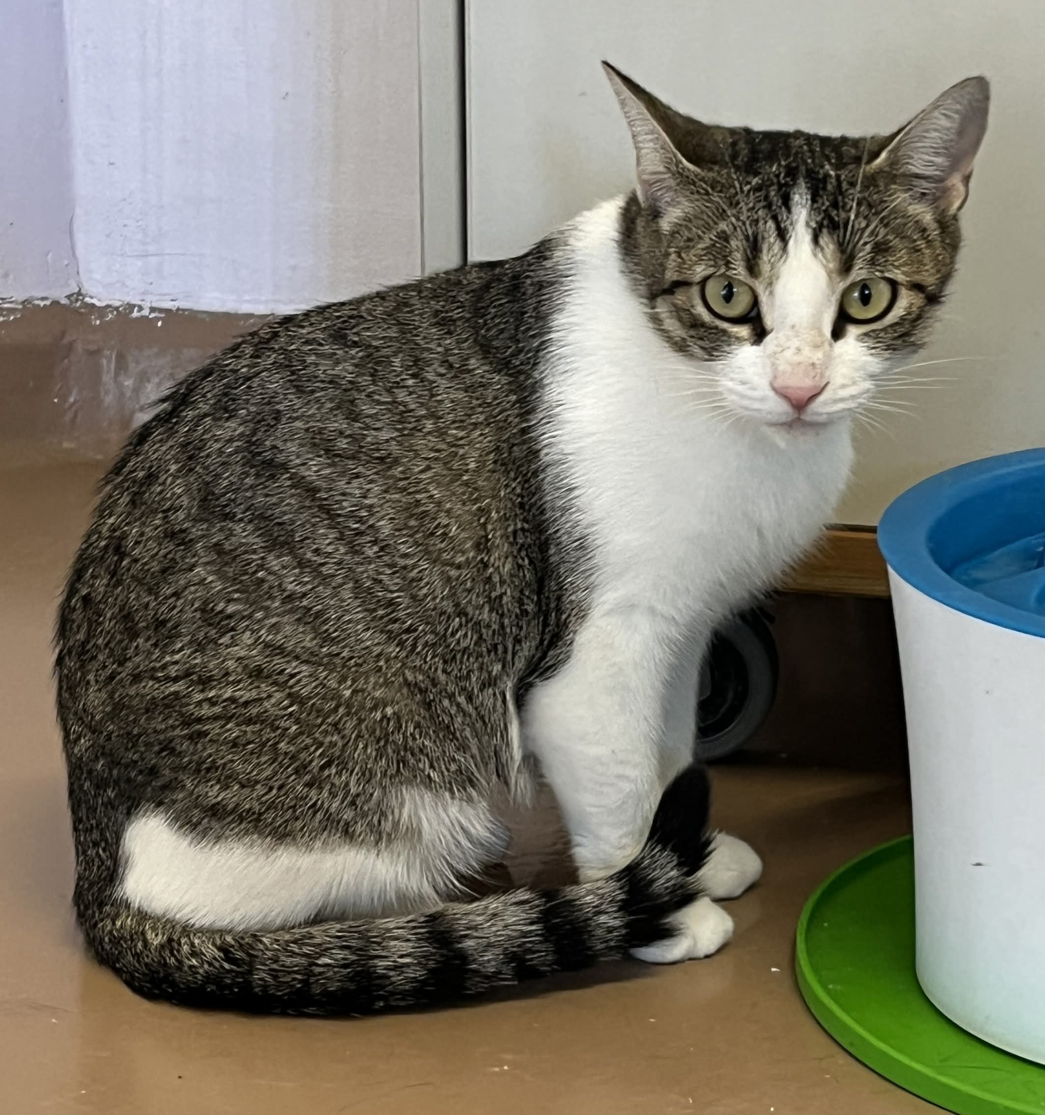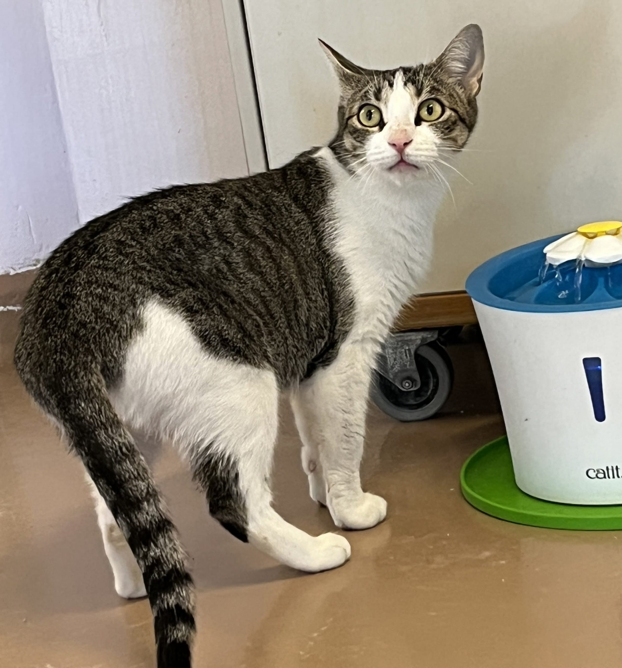 Avec son physique d’élégante ballerine, ses yeux verts-dorés pétillants et son joli pelage blanc et tabby, cette charmante féline est prête à l’adoption et la rencontrer… c’est l’adopter!
