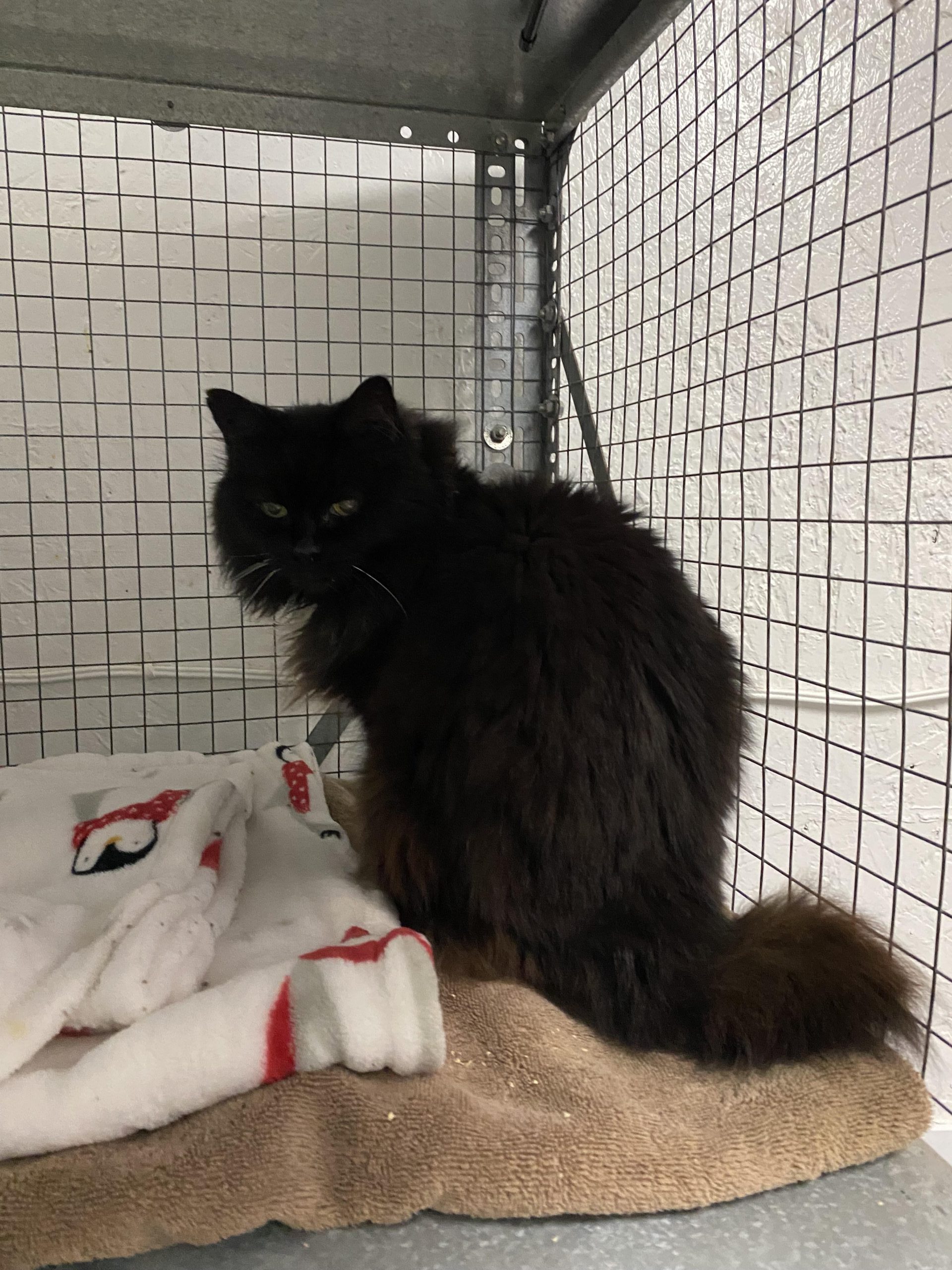 une charmante chatte à poils longs qui a récemment été amenée à notre refuge en tant qu’animal errant. Elle est âgée d’environ 13 ans.