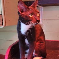 Elle est joueuse, énergique et ronronne beaucoup. Elle se laisse prendre et manipuler facilement. Elle est en adoption humanitaire, dû à un souffle au cœur important. Elle est tout de même en pleine forme.