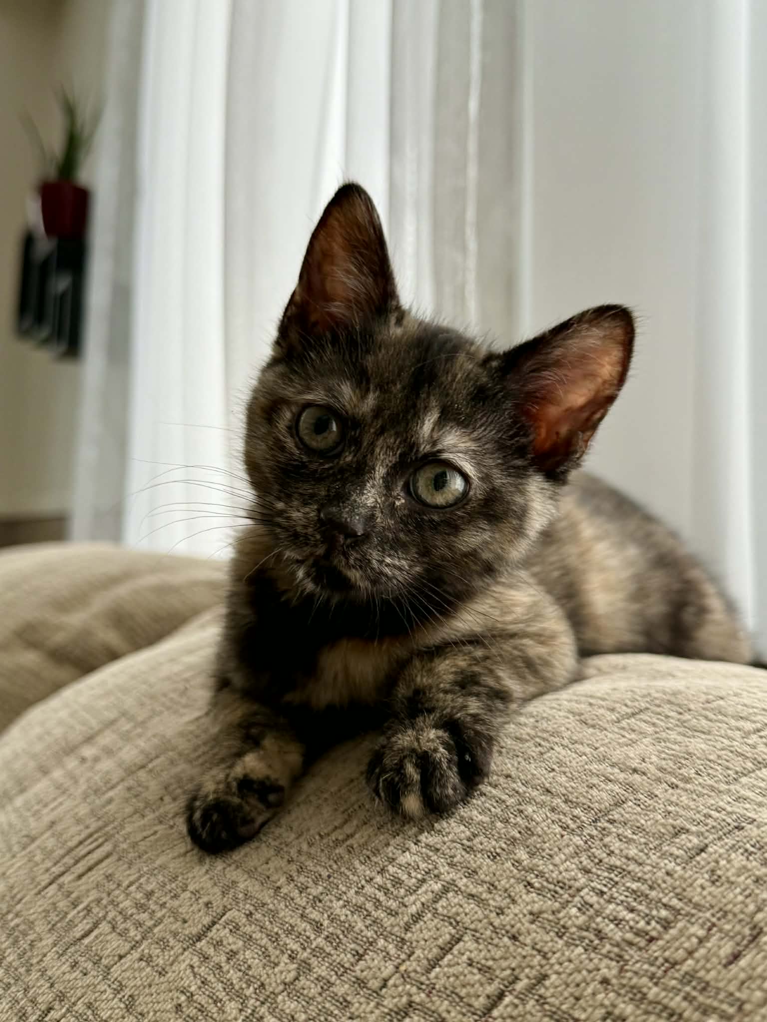 «Pourquoi Angélique? Parce que j’avais l’air d’un petit ange quand je dormais sur ma maman d’accueil après mes boires. J’ai environ 3 mois et mon pelage est de couleur écaille de tortue.