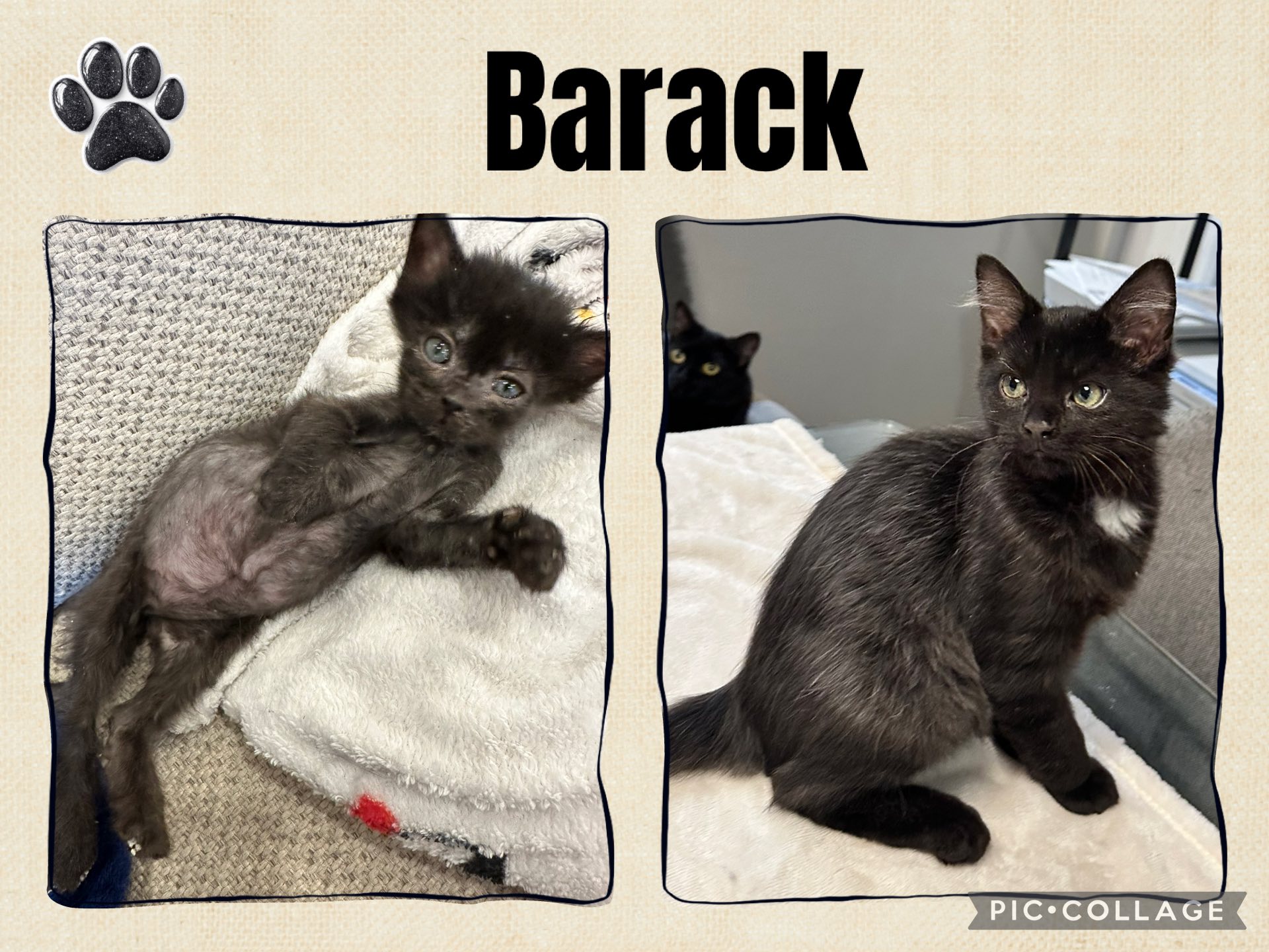 Barack est un chaton qui a été biberonné et extrêmement gâté! Ayant été trouvé dehors lorsqu’il avait environ 3 semaines, il avait été nourrit au lait de vache, ce qui lui avait créé des carences et lui a fait perdre tout son poils.