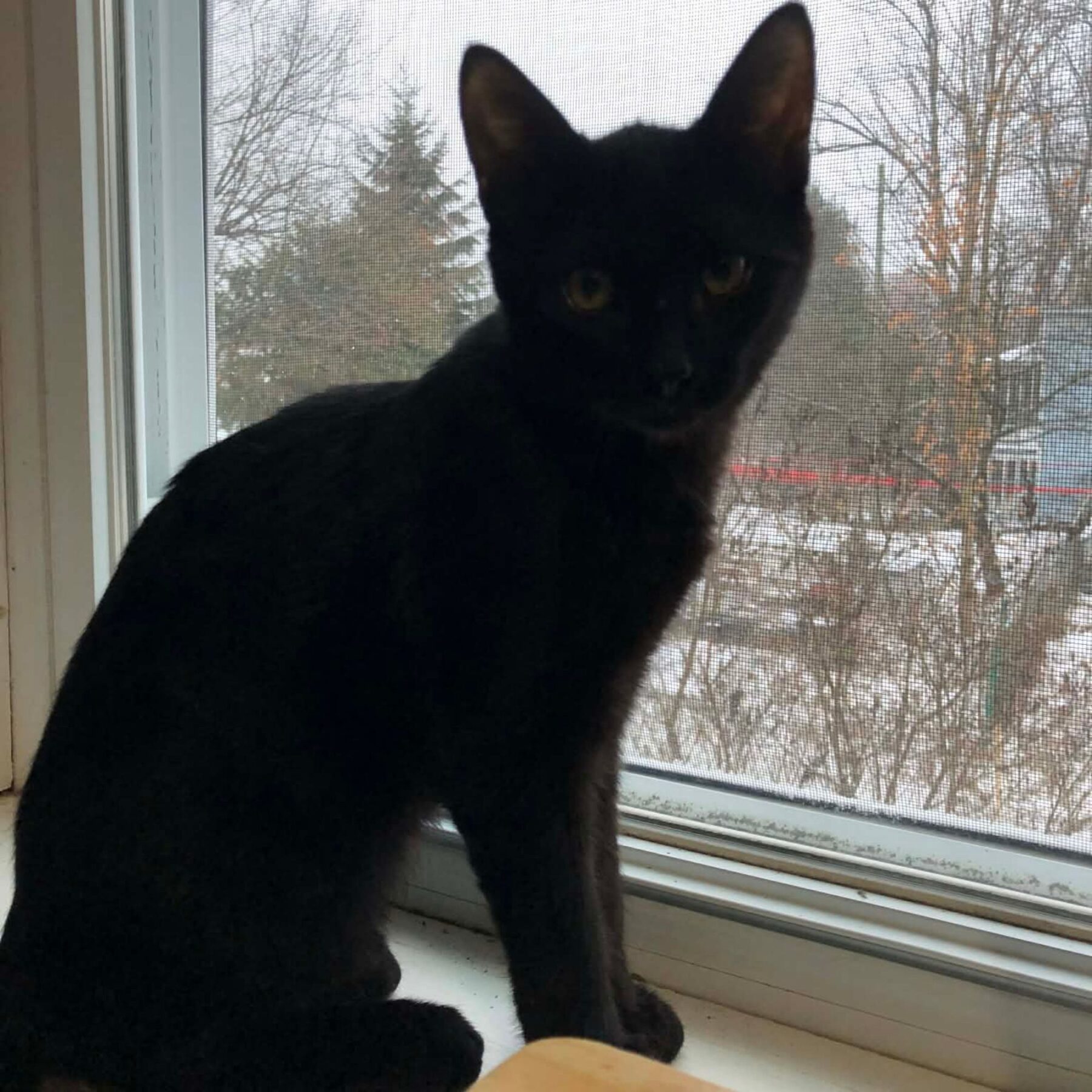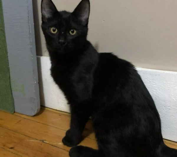 « Je suis un jeune chat noir enjoué qui adore courir, jouer avec des lacets ou autres petits jouets et me coller près des humains. Je ronronne au moindre câlin et j’adore me faire flatter. Je suis particulièrement curieux et joueur. Ma famille d’accueil me trouve parfois maladroit, mais ça les fait bien rire! J’aimerais une famille qui aime jouer avec moi, mais aussi qui aime se laisser coller lors de moments plus calmes. »