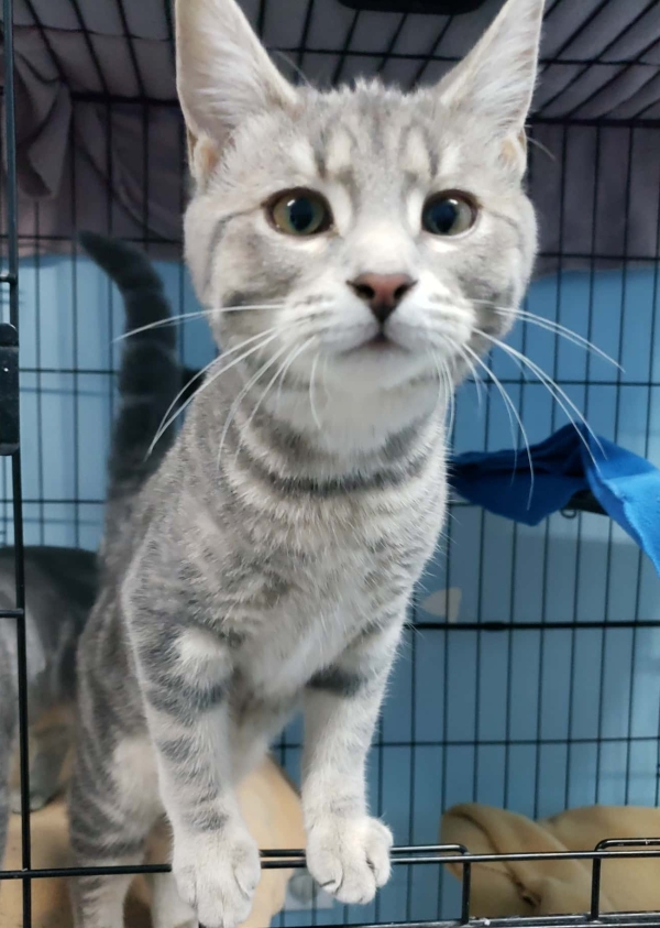 Billy Jean est une tabby grise à poil court, âgée de 4 mois.
