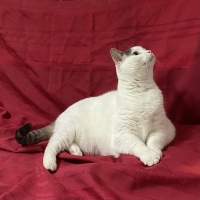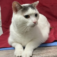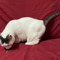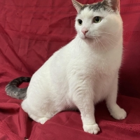 Une grande chatte blanche avec du gris sur la tête et la queue. Elle a environ 4 ans.