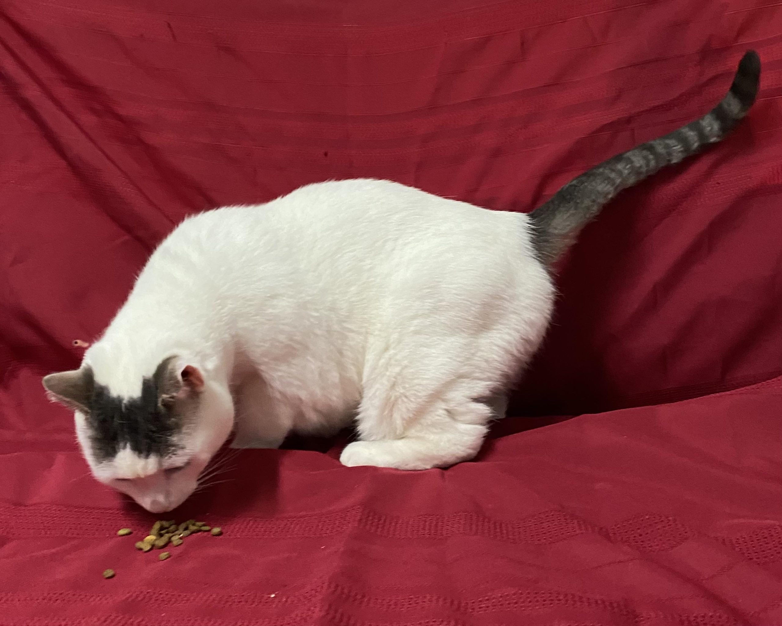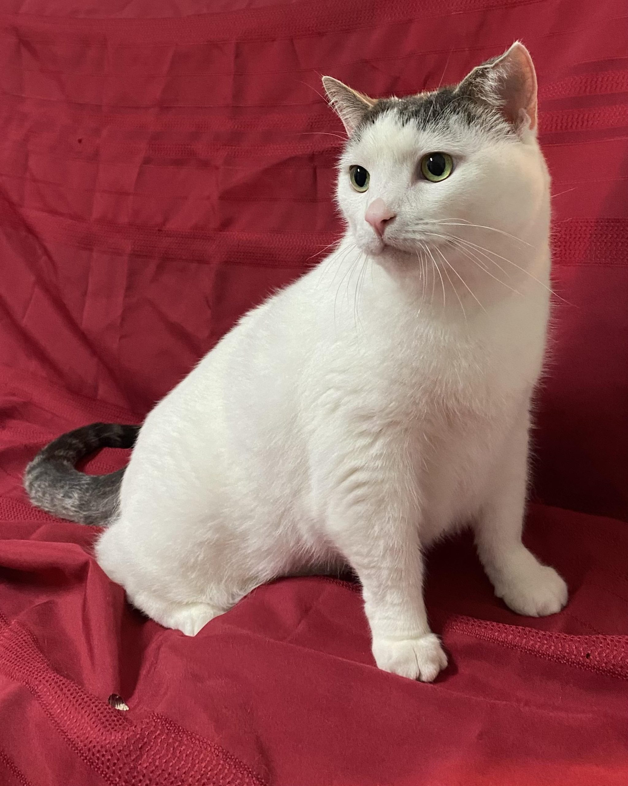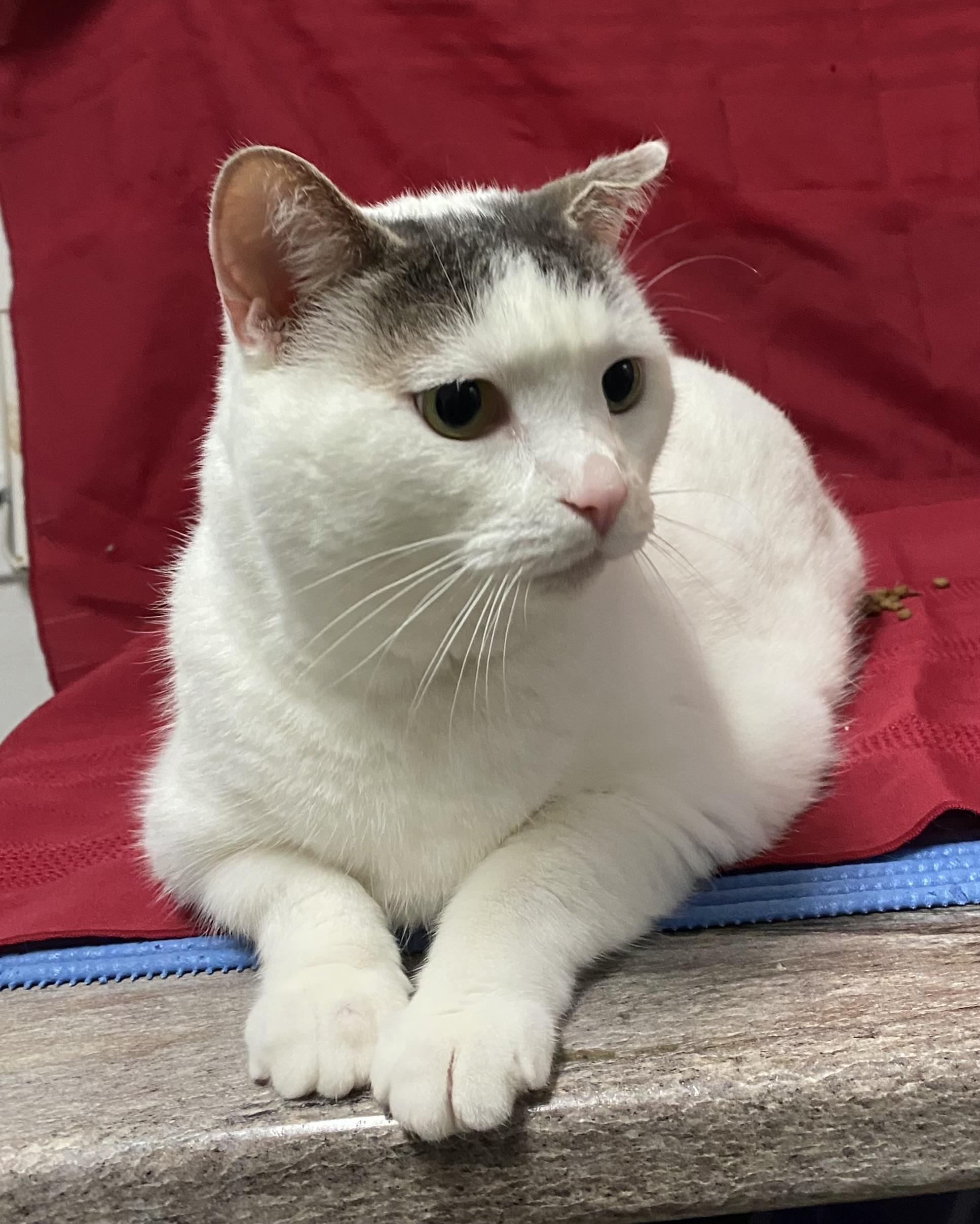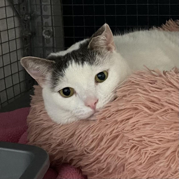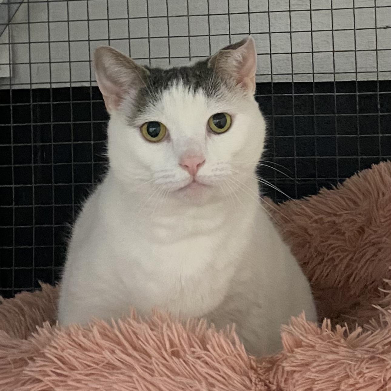Une grande chatte blanche avec du gris sur la tête et la queue. Elle a environ 4 ans.