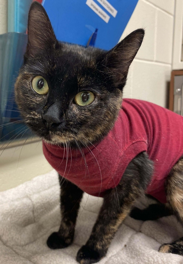 Sur la photo, elle porte un petit pyjama suite à sa stérilisation. Un détail qui la rend encore plus touchante, presque maladroite, avec ce petit air loufoque qui fait sourire… et fondre instantanément.
