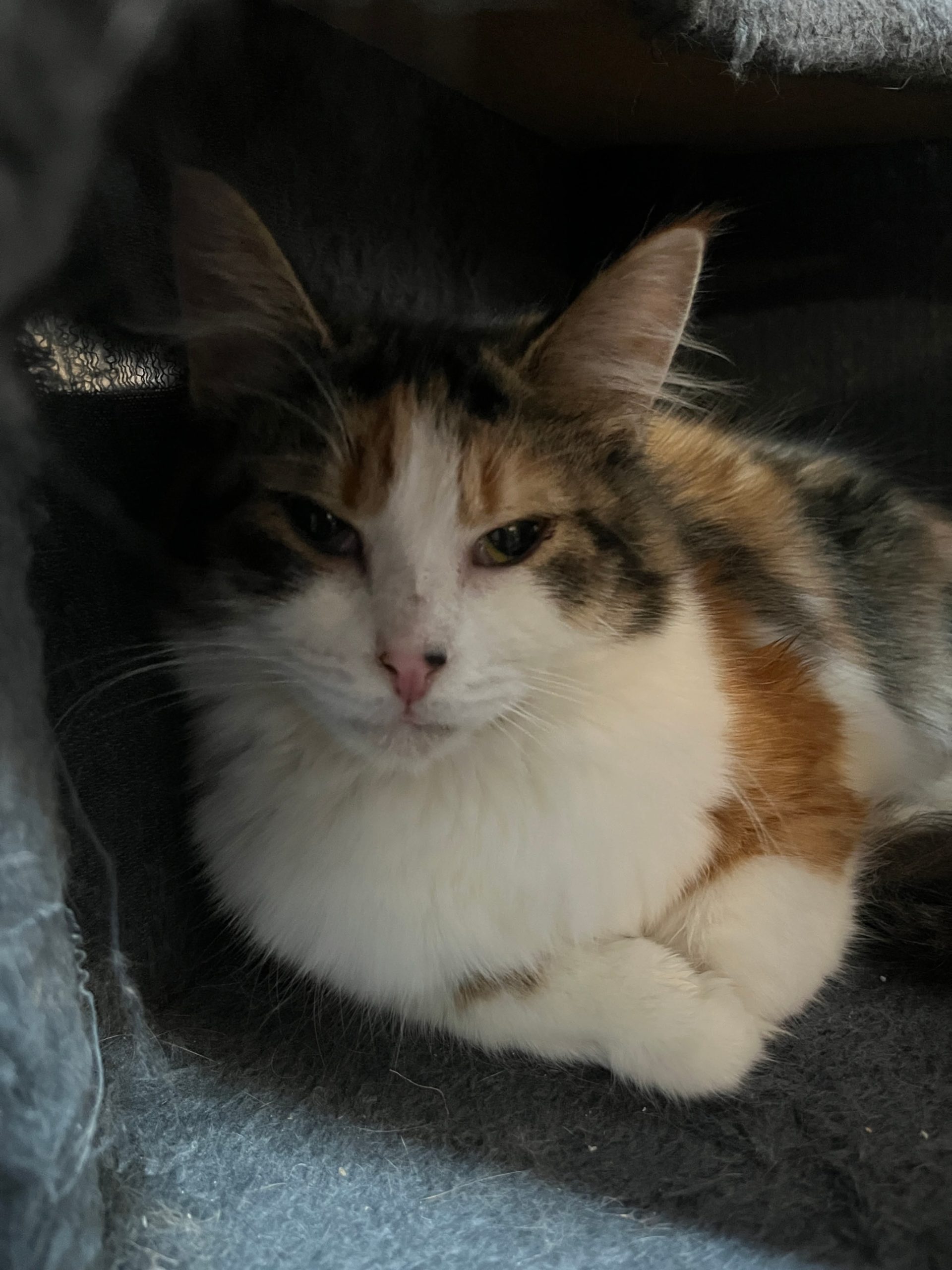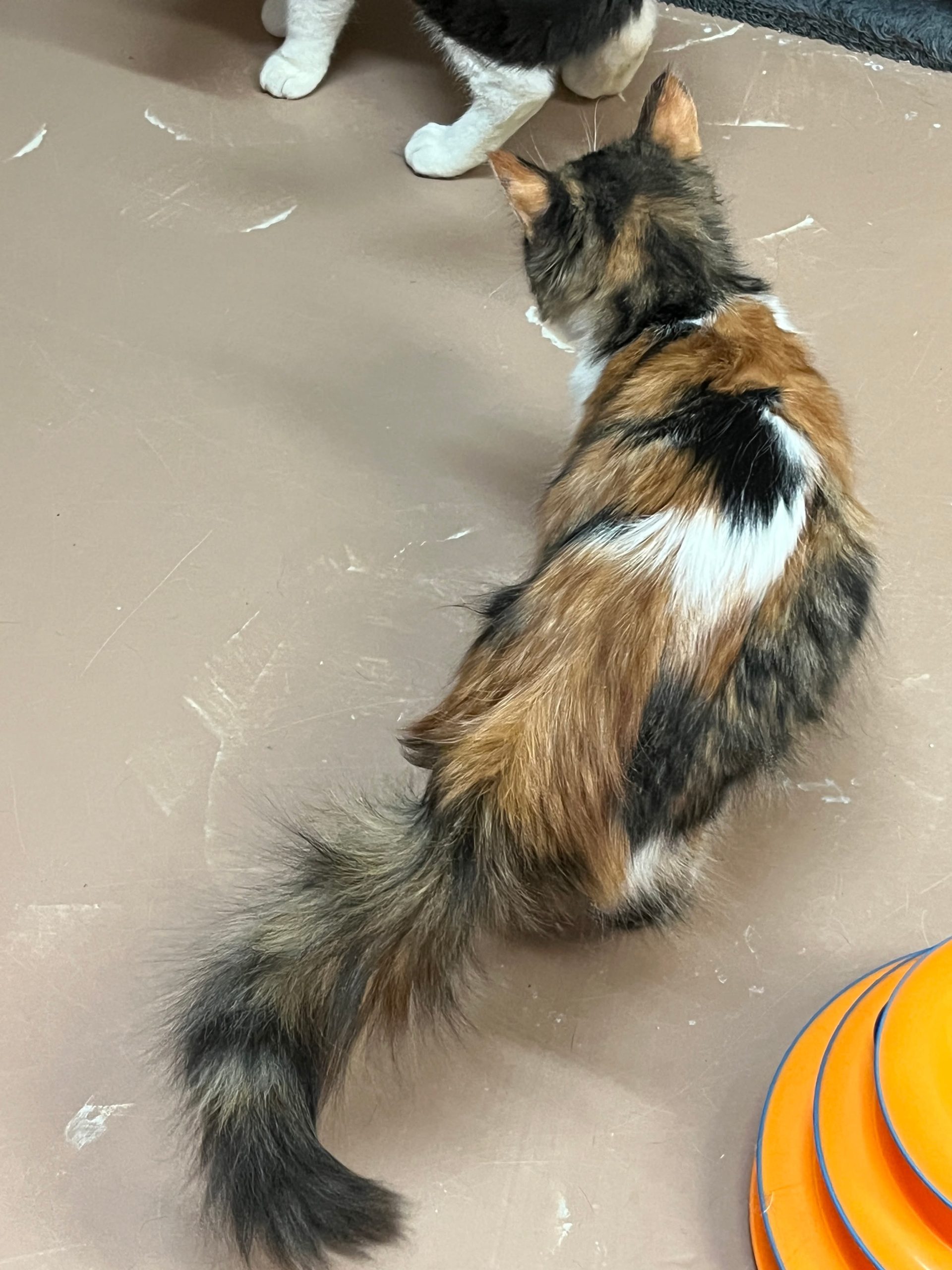 Carlotta est une splendide chatonne calico au pelage mi-long très attrayant. Délicate, menue et dotée d’un tempérament doux, cette petite merveille vous regarde avec une innocence désarmante combinée avec une pointe d’inquiétude. On voit déjà, à son jeune âge, qu’elle possède la fibre d’une irrésistible diva!