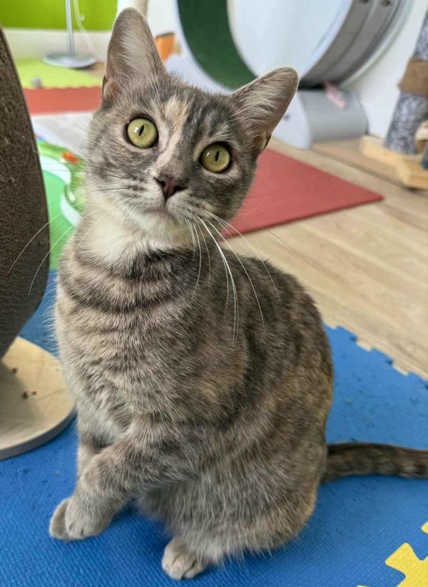 Voici Cassiopée! Laissons-la se présenter: «Je m’appelle Cassiopée, j’ai environ 1 an et mon pelage est court et de couleur calico dilué....