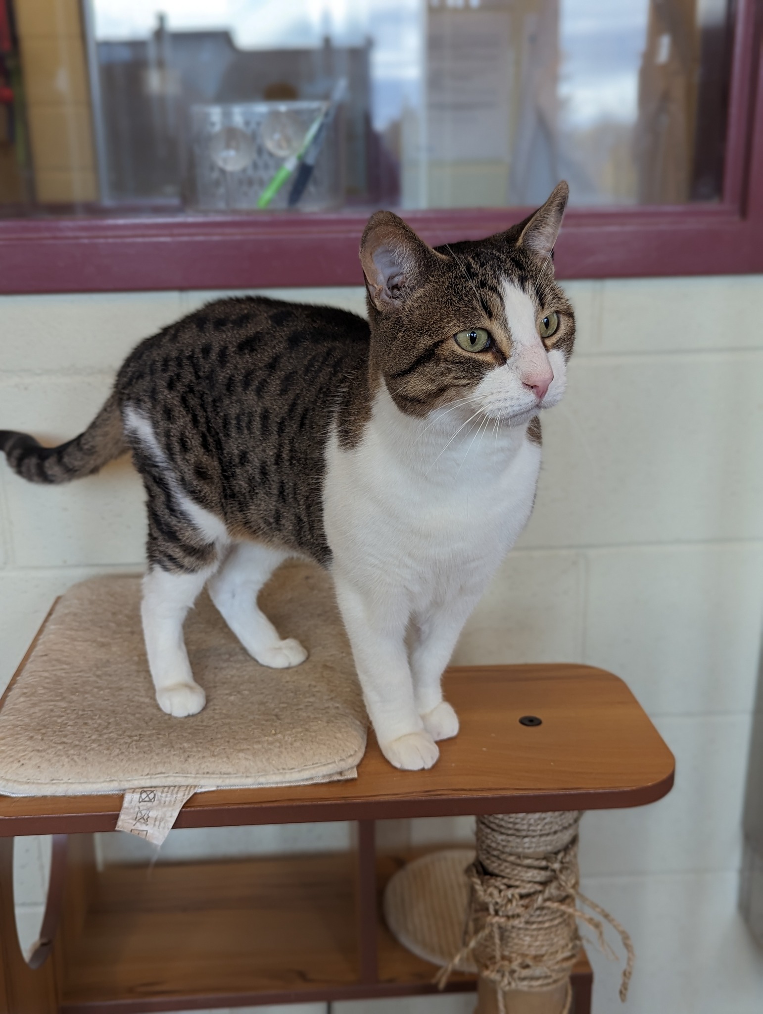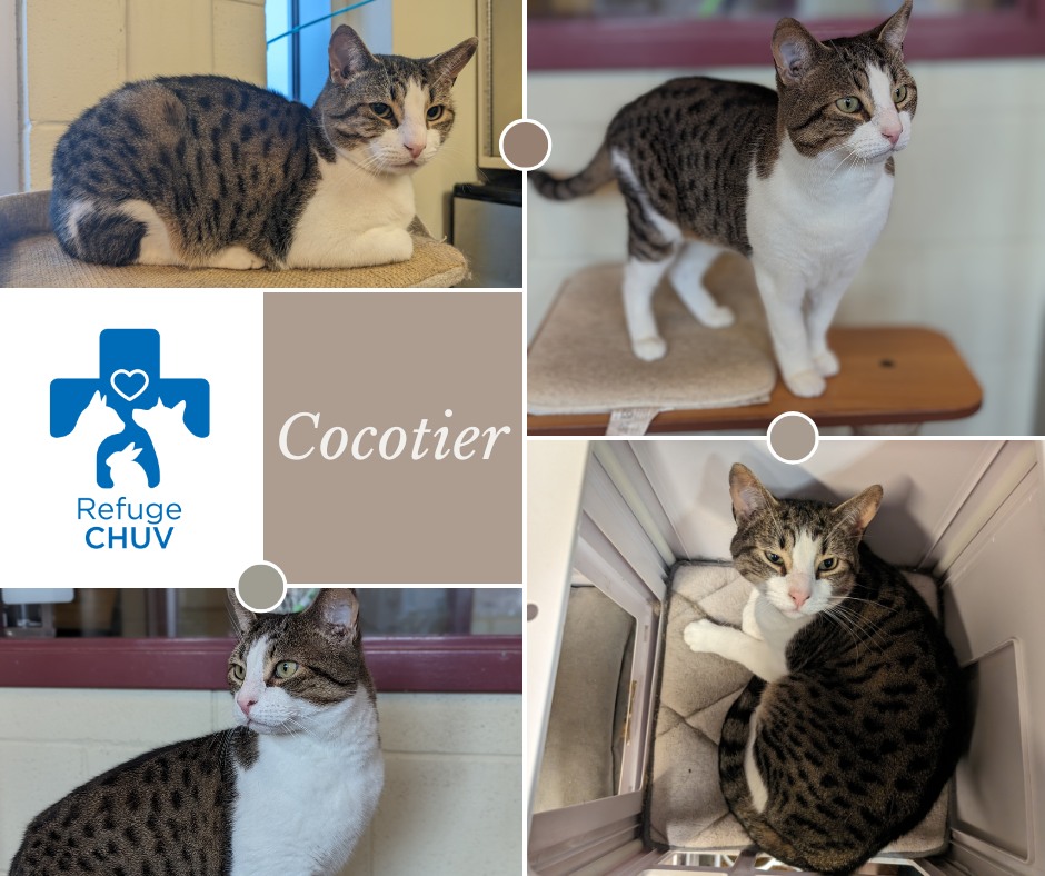 Si on est occupés, il s’installera confortablement près de nous et attendra son tour. Cocotier est un chat adulte au tempérament très calme et doux, qui espère très fort passer son premier temps des fêtes dans un foyer rempli d’amour.