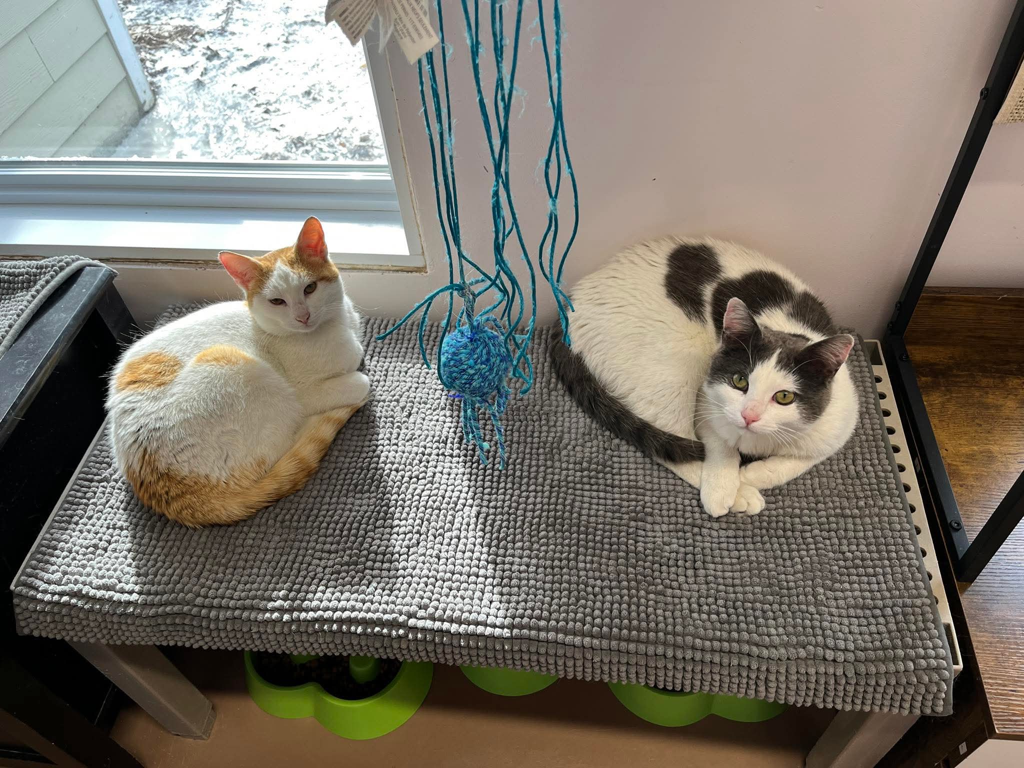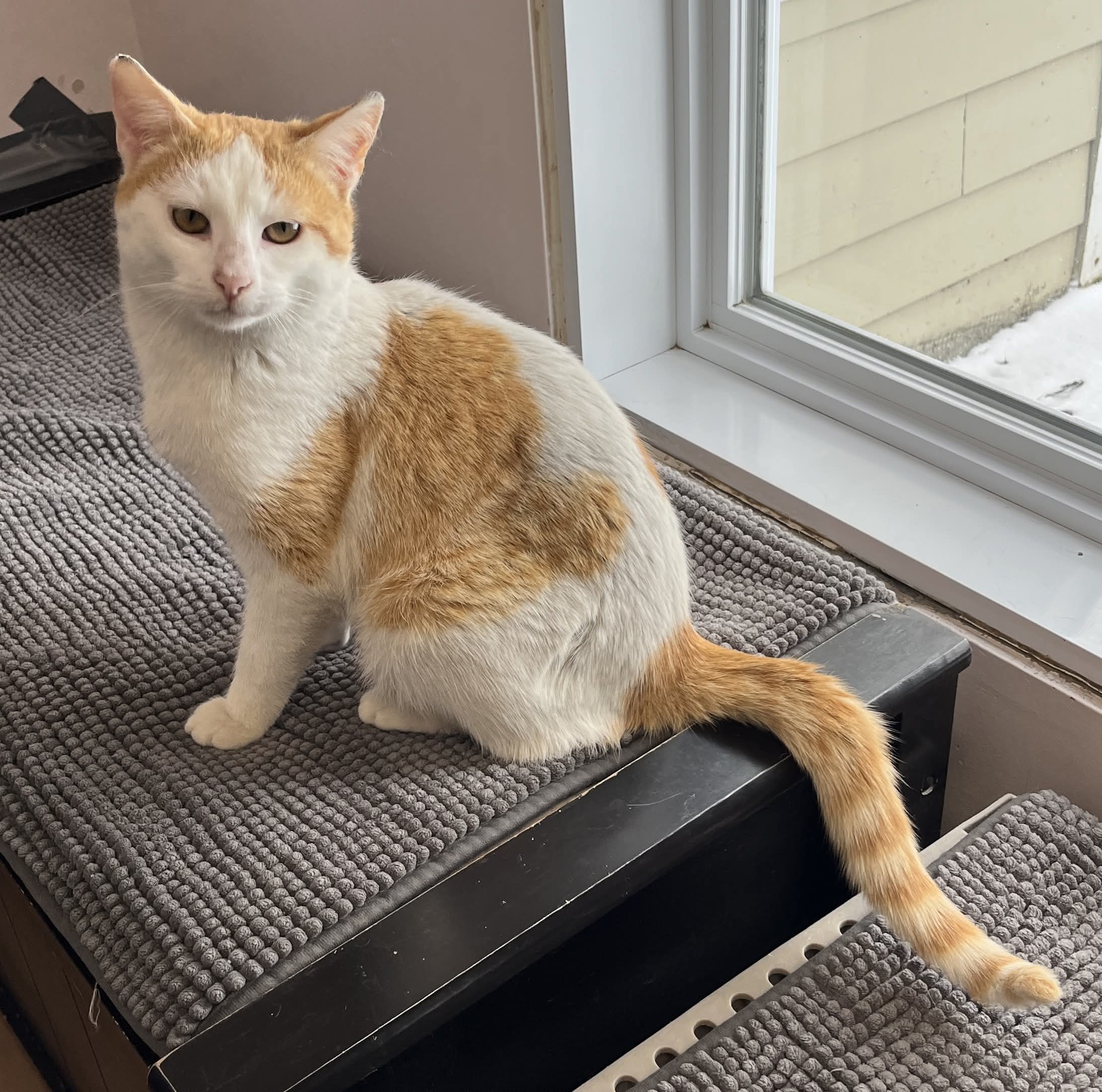 Le captivant jeunot a été confié au refuge le 28 février 2026 après qu’une personne au grand coeur l’a recueilli avec son frère (ou copain) Creampuff. Les deux pauvres chéris auraient été trouvés dehors près d’une ferme où ils tentaient de trouver quelque chose à manger et se mettre à l’abri du froid et de la neige. Les garçons avaient de légères blessures au visage; leur fourrure était bien dense mais leur sous-poil semble taché par on ne sait pas trop quoi. Une fois pris en charge, nous avons constaté avec joie que Creamsicle et Creampuff étaient sociables avec les humains et facilement manipulables.