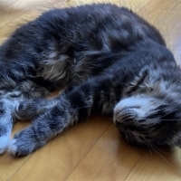 Croustillon est un chat gris foncé à poil long avec des zébrures beiges et brunes et quelques taches blanches. Ce petit chat se laisse très facilement brosser, prendre dans les bras et câliner. Il arrive rapidement lorsqu’on l’appelle et aime observer les tâches en cours de réalisation s’il ne fait pas sa sieste. Il aime beaucoup jouer et avoir de l’attention.