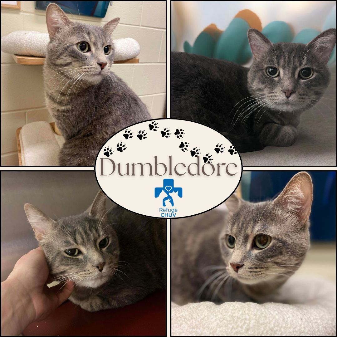 Dumbledore est arrivé au refuge avec son frère Horcruxe. Depuis, il fait de son mieux dans un environnement qui l’impressionne beaucoup. C’est un jeune chat sensible et timide… mais jamais agressif.
