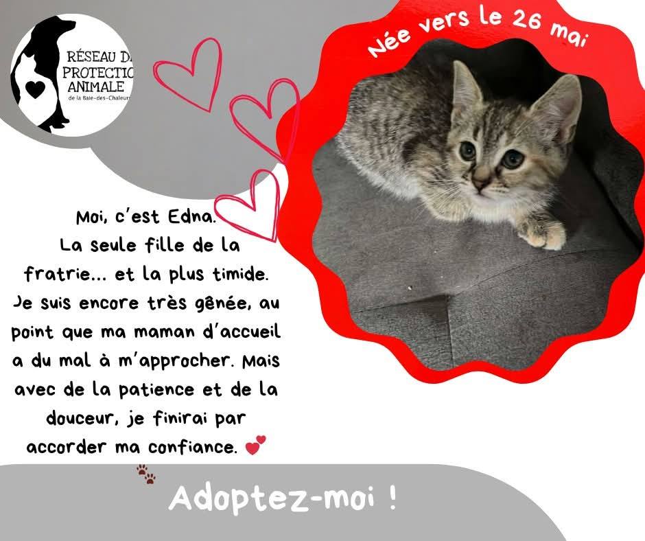 Voici Edna! Edna est une petite chatte un peu craintive au début, mais elle se révèle vite très affectueuse.   Elle adore jouer...