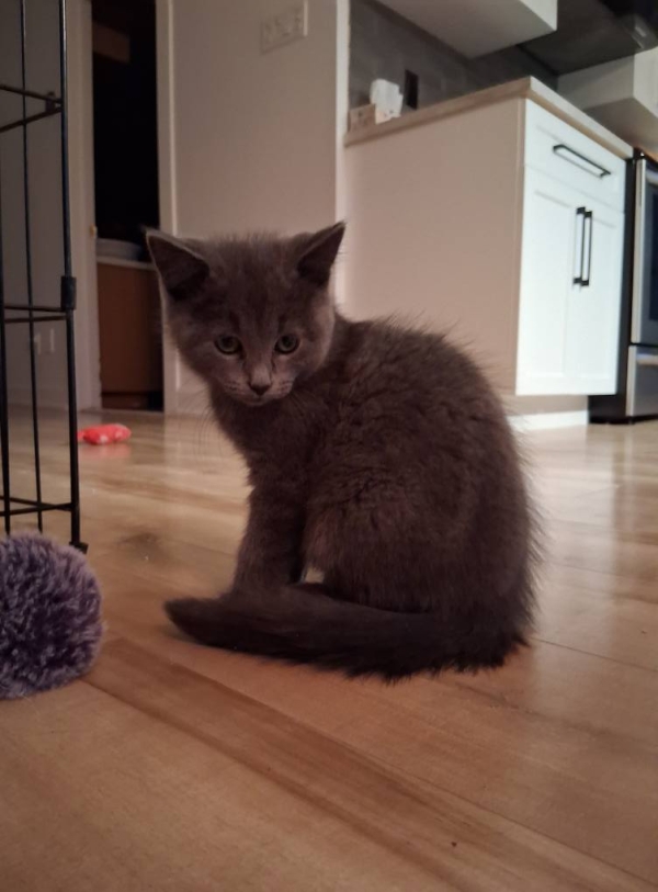 Le beau Gabriel est un chaton gris qui ne passe pas inaperçue . C’est une petite boule d’énergie. Il est super joueur. Il cohabite avec d’autres chats et n’a aucun problème avec eux . Il ronronne lorsqu’il est dans nos bras.