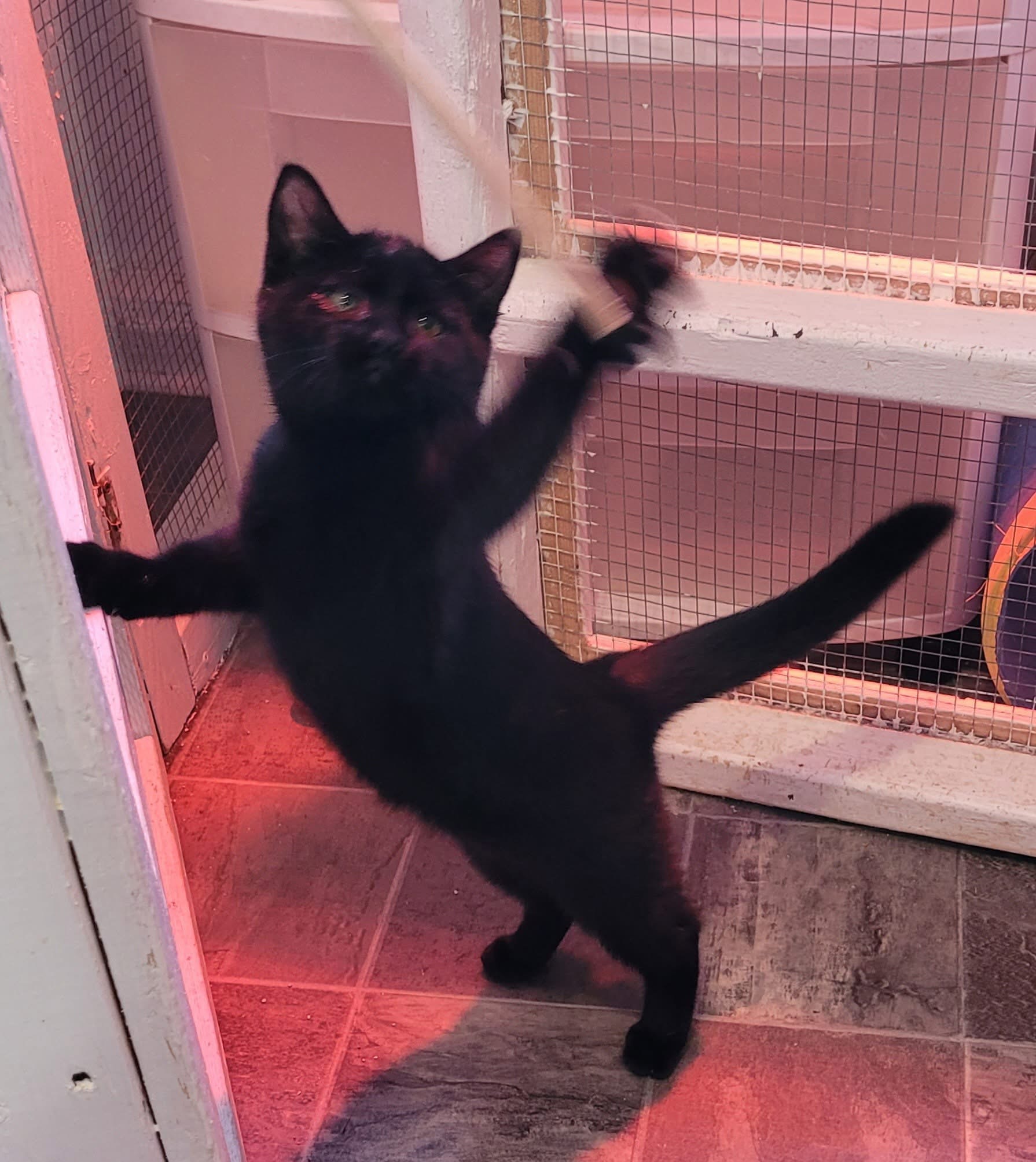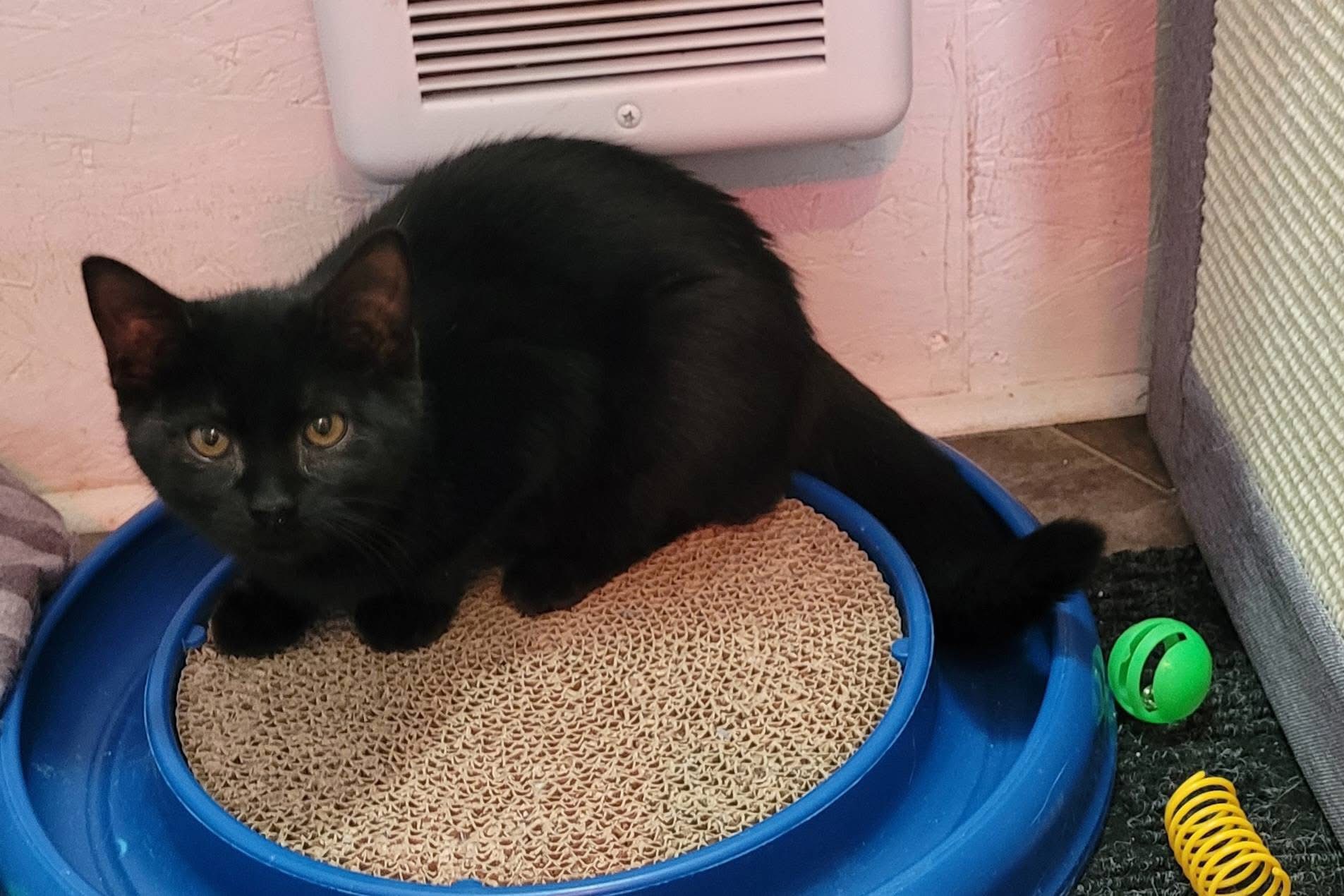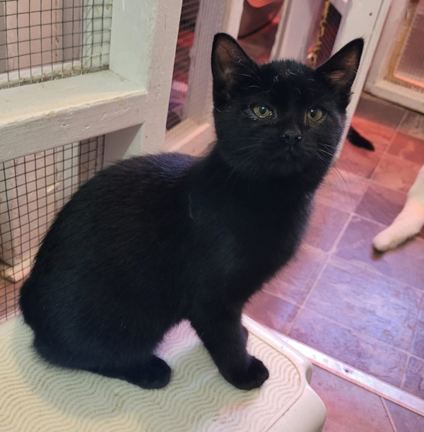 Une élégante femelle noire à poil court âgée d’environ 3,5 mois, née autour du 20 août 2025.