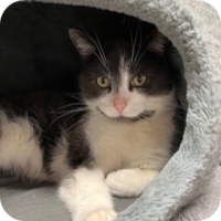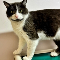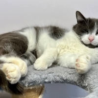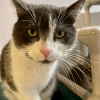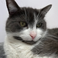 Griffon est un grand gaillard gris et blanc avec un joli nez rose et de superbes yeux verts tristes. Il est en excellente santé. Trouvé errant au début de décembre 2024, une gentille dame le nourrissait dans sa cour alors qu’un jour, il s’est laissé flatter et elle a réussi à le rentrer dans la maison. On nous l’a ensuite confié au refuge afin de lui offrir un meilleur avenir, en toute sécurité!