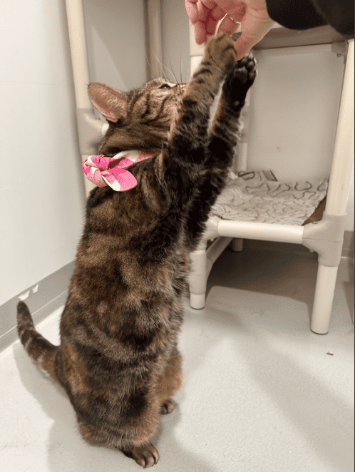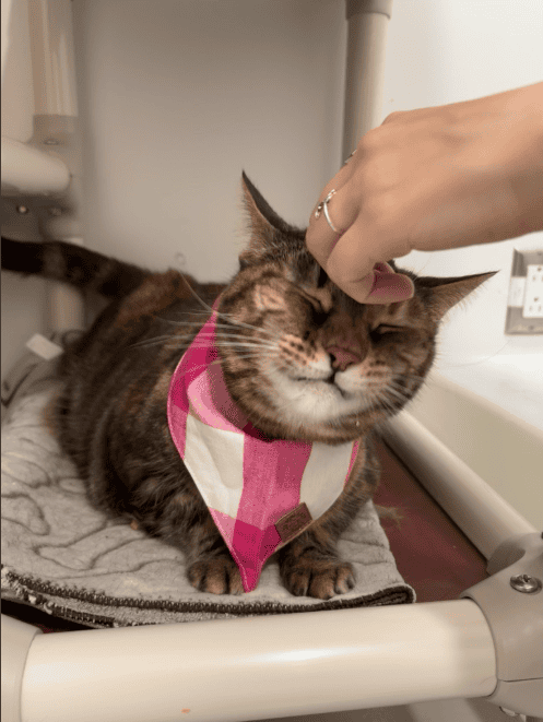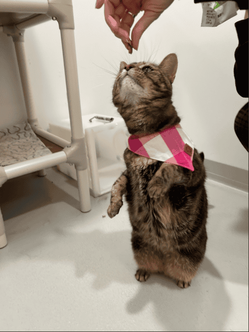 Grande amoureuse du contact humain, Gucci se colle contre nous, cherche les caresses et fond littéralement sous les gratouilles, surtout derrière les oreilles. Elle adore les séances de brossage, joue avec enthousiasme à la canne à pêche et se laisse facilement amadouer par des gâteries. Calme, douce, câlineuse et sans aucune malice, Gucci est une compagne exceptionnelle — une vraie dame au cœur tendre qui ne demande qu’à aimer et être aimée.