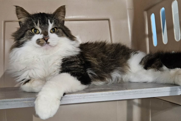 Hansel est un adorable ado-chaton tabby brun et blanc au poil long d’un peu moins de 1 an.