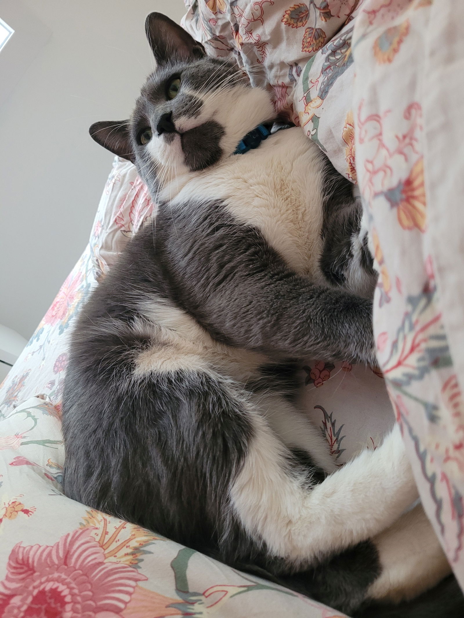 Hugo a été trouvé errant en novembre 2025. Hugo vit pour les câlins ! Il adore grimper sur les genoux, le torse ou même les épaules de ses humains — que ce soit sur le divan, le lit ou même aux toilettes ! Lorsqu’on le caresse, il exprime tout son bonheur : il fait des biscuits dans les airs, se frotte contre ses humains et se roule dans tous les sens.