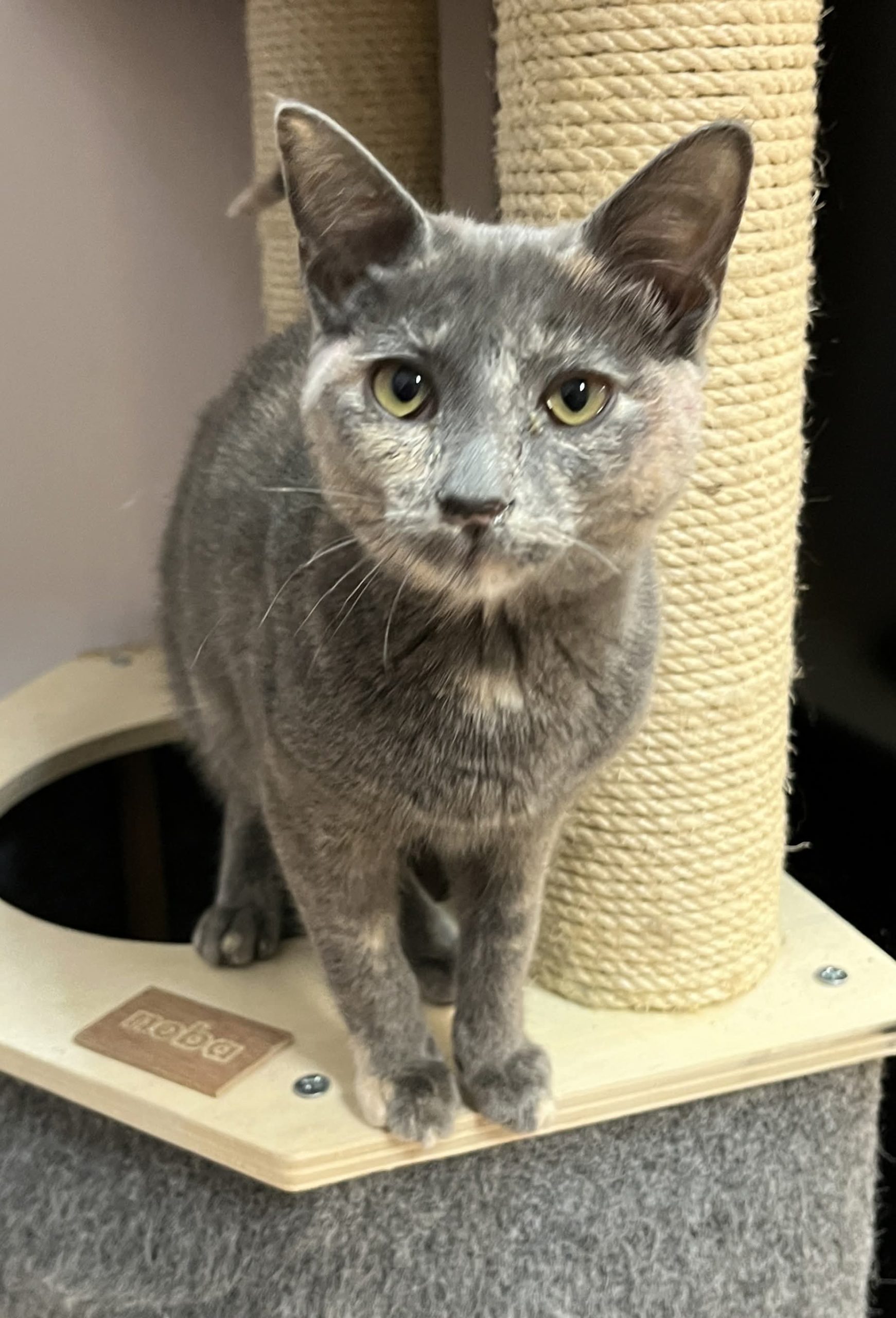 - Serait heureuse de disposer d’un arbre à chat et de cohabiter avec un ami chat