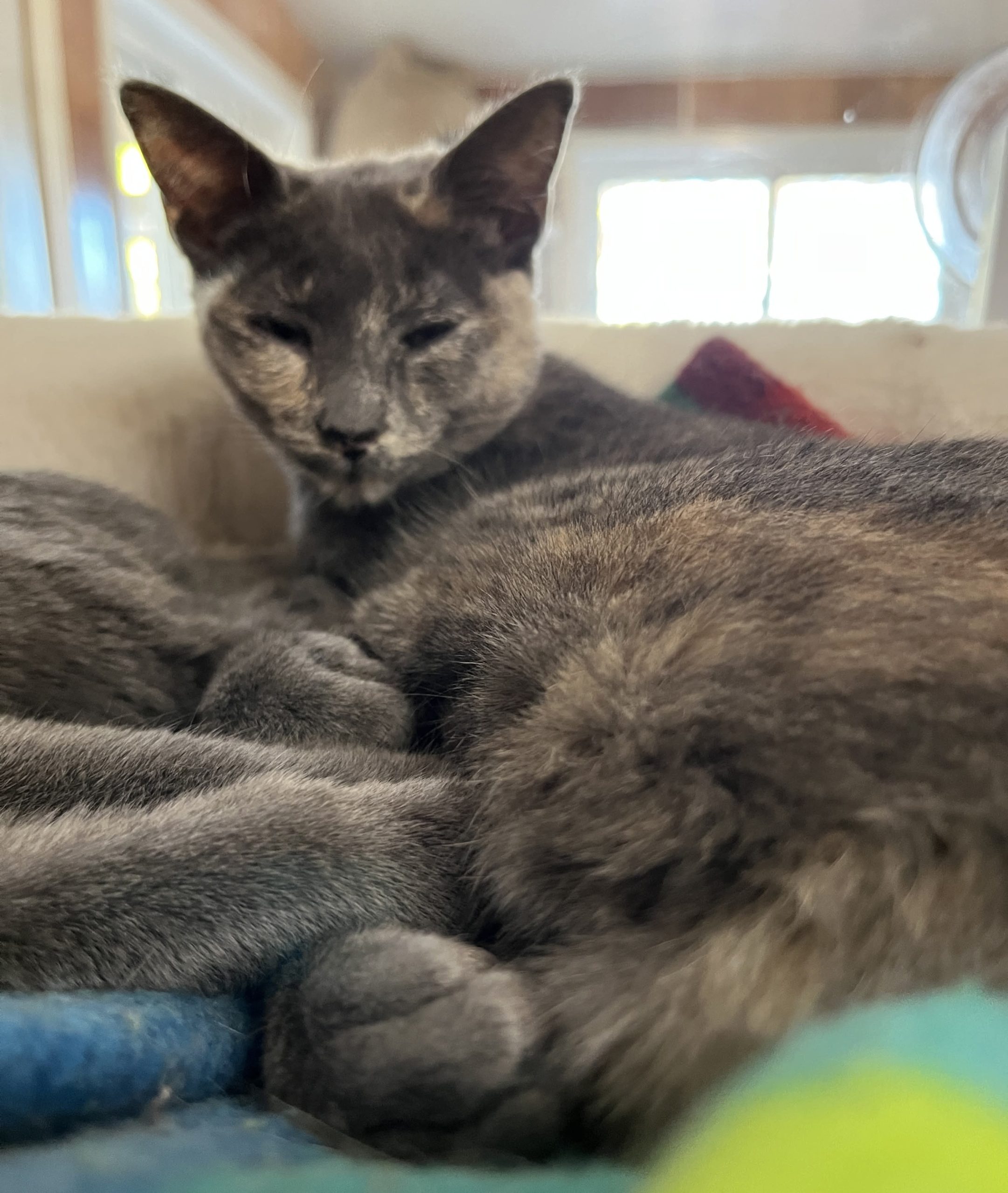 Jade a été placée dans la salle commune avec ses frères et partage son espace avec une vingtaine d’autres chats adultes. Impressionnée par tous ces colocataires inconnus, la minette a d’abord eu peur mais ses craintes se sont rapidement dissipées et elle s’est mise à explorer avec exubérance chaque centimètre de son nouvel environnement, en tandem avec ses frérots. Agile et active, Jade avec ses pattes fines escalade facilement les arbres à chats et saute sur les tablettes en hauteur sans hésitation. Dans sa nouvelle demeure, vous devrez lui offrir un grand arbre à chats pour satisfaire son besoin de grimper. La bout de chou est très curieuse et enjouée. Elle s’amuse avec ses jouets (et se tiraillait amicalement avec sa fratrie avant qu’ils partent). Jade faisait aussi la sieste collée sur les autres chatons, parfois installé un par-dessus l’autre, dans un petit lit douillet et moelleux pour se sentir en sécurité. Maintenant seule, la pauvre chérie est plutôt désorientée et cherche ses frères partout. Son moral est à son plus bas.