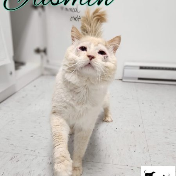 Petit détail charmant : Jasmin a récemment été opéré pour corriger des entropions, une condition où les paupières roulent vers l’intérieur, ce qui causait de l’irritation. Il garde de petites cicatrices autour des yeux… mais cela ne fait qu’ajouter à son charme irrésistible!