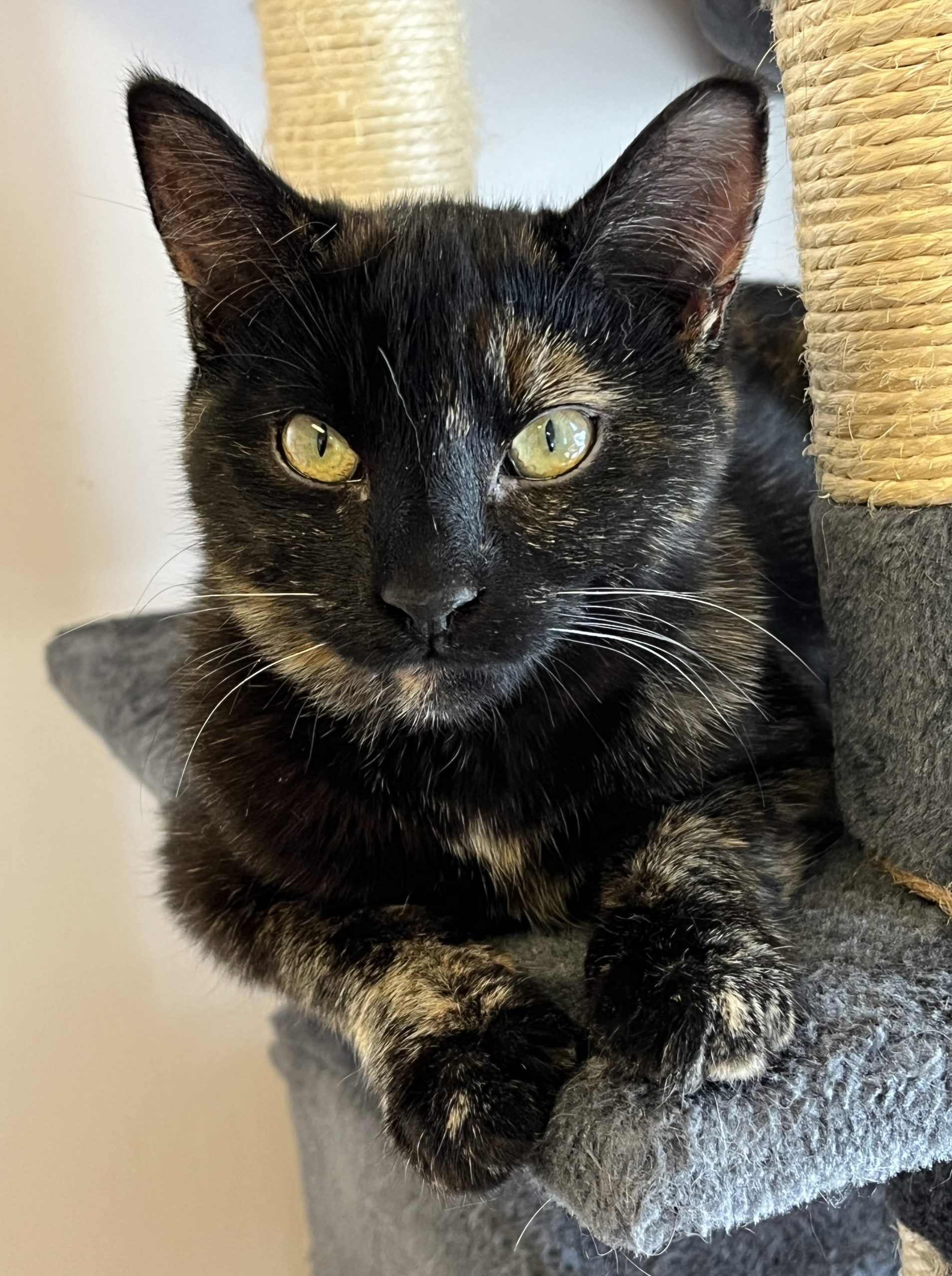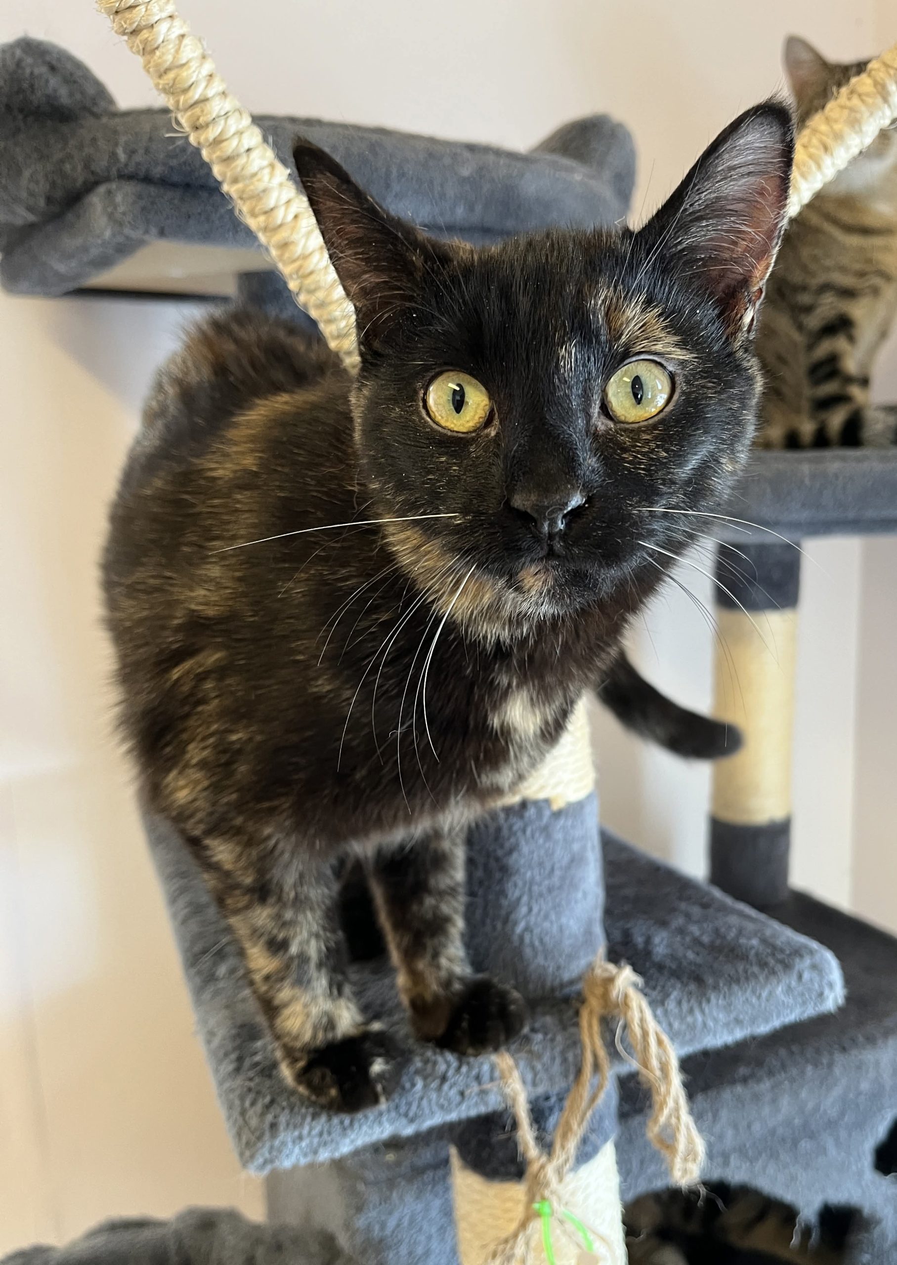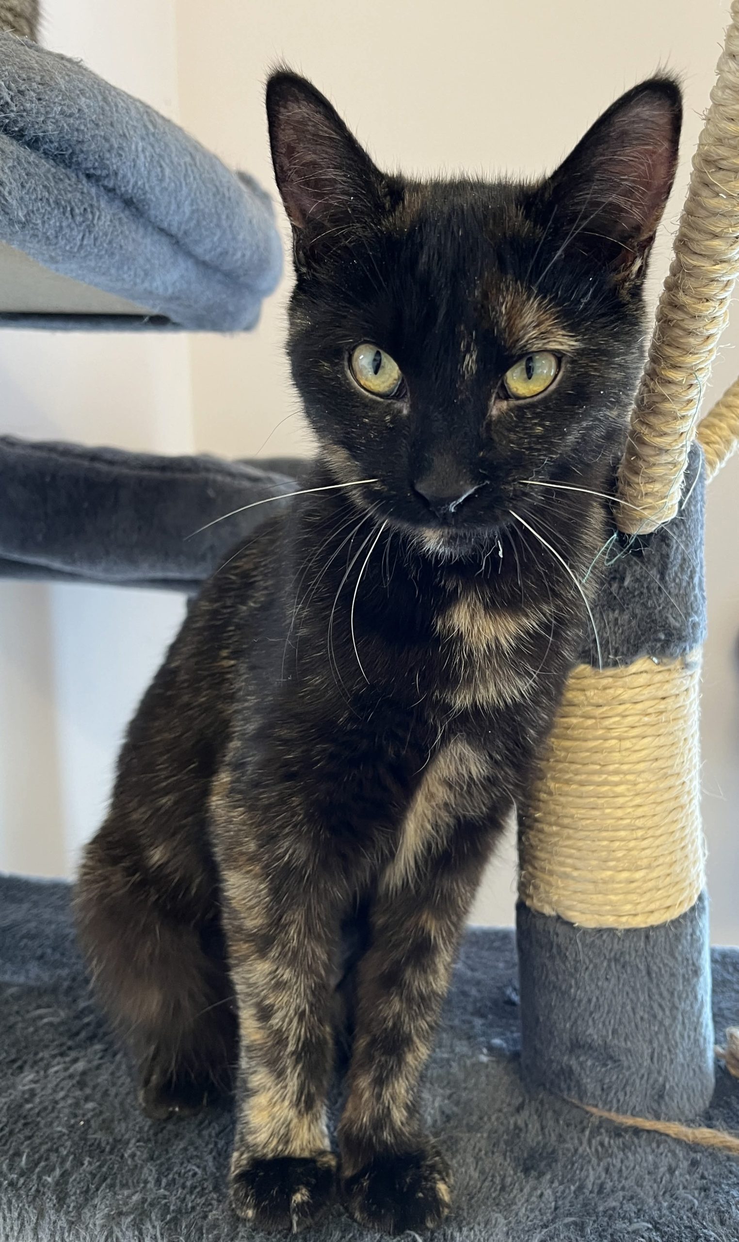 Jolie est tout simplement ravissante avec son pelage couleur écaille de tortue lustré et ses sublimes yeux verts-dorés au regard lumineux, empreint d’intelligence et de curiosité. Élancée, gracieuse et encore plutôt menue, la charmante demoiselle est en excellente santé.