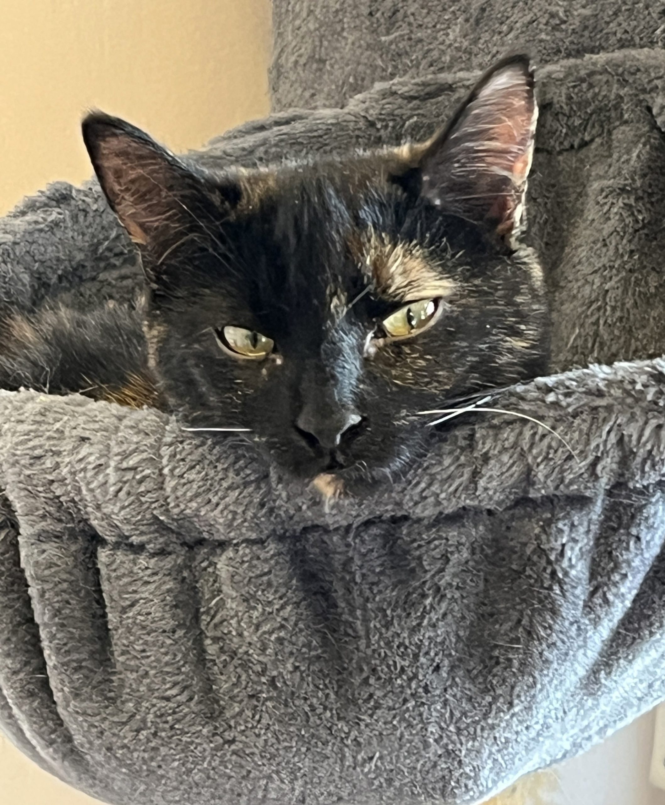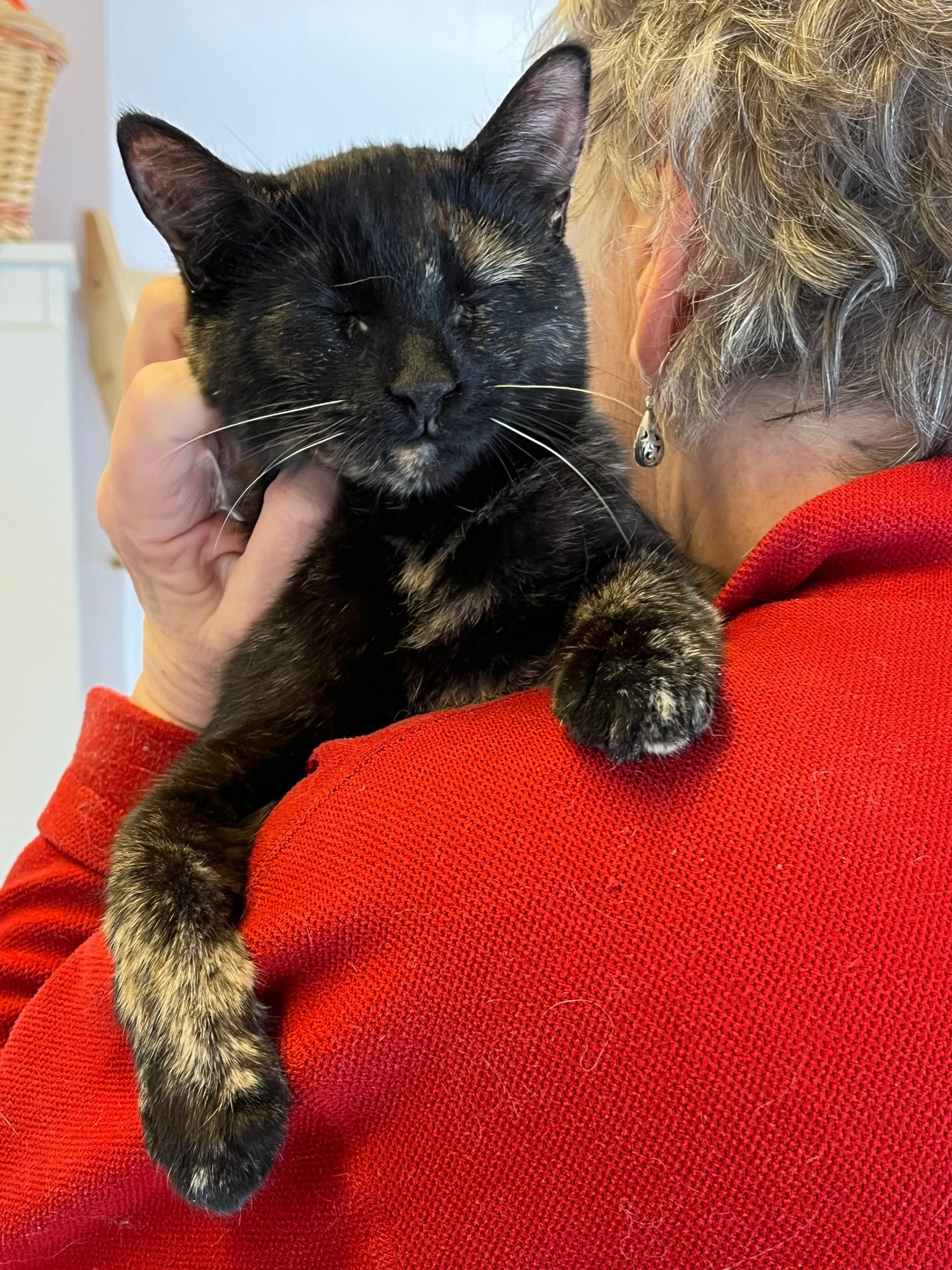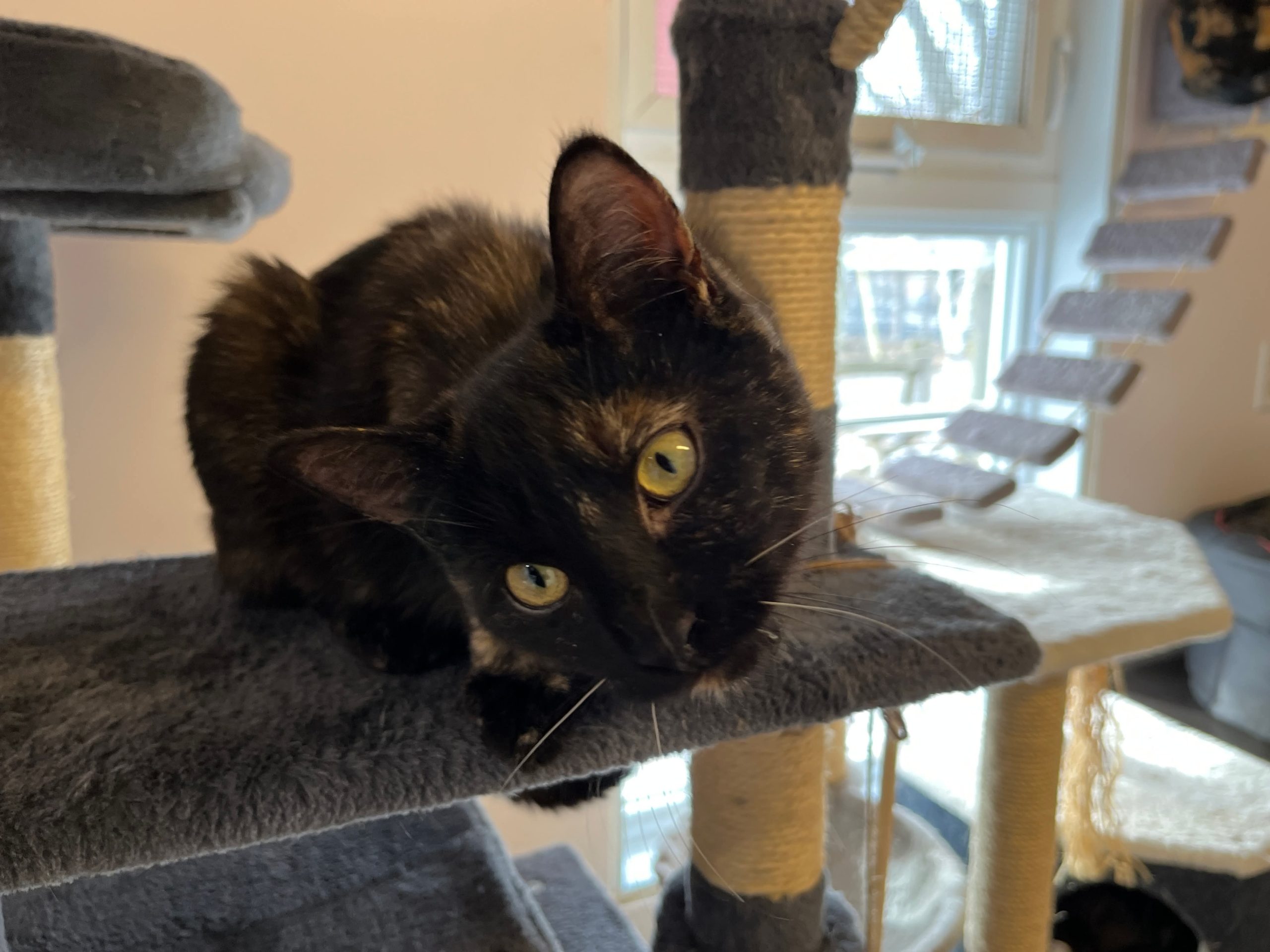 Jolie est tout simplement ravissante avec son pelage couleur écaille de tortue lustré et ses sublimes yeux verts-dorés au regard lumineux, empreint d’intelligence et de curiosité. Élancée, gracieuse et encore plutôt menue, la charmante demoiselle est en excellente santé.