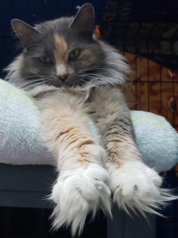 Une magnifique femelle calico diluée à poil long âgée de 3 ans. Elle a été trouvée errante dans les grands froids cet hiver.