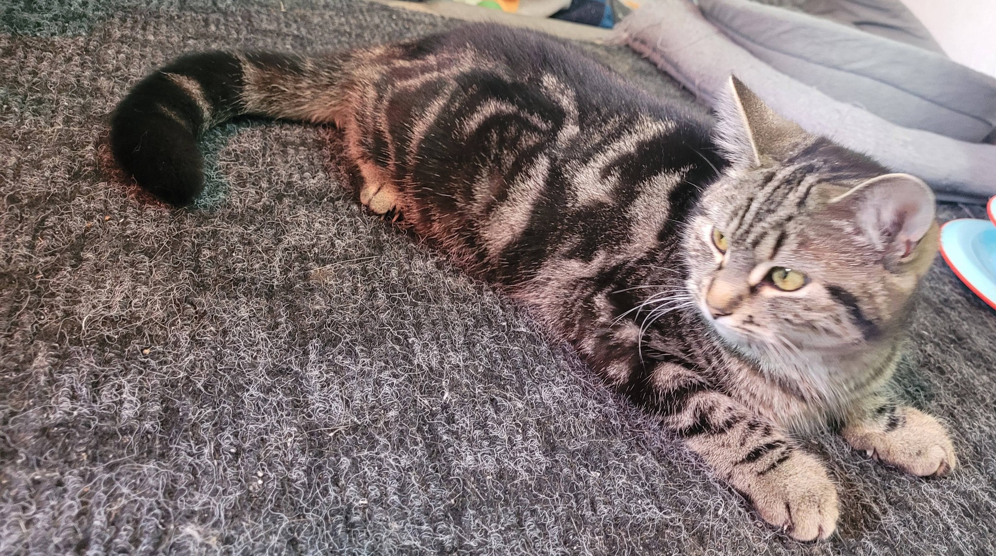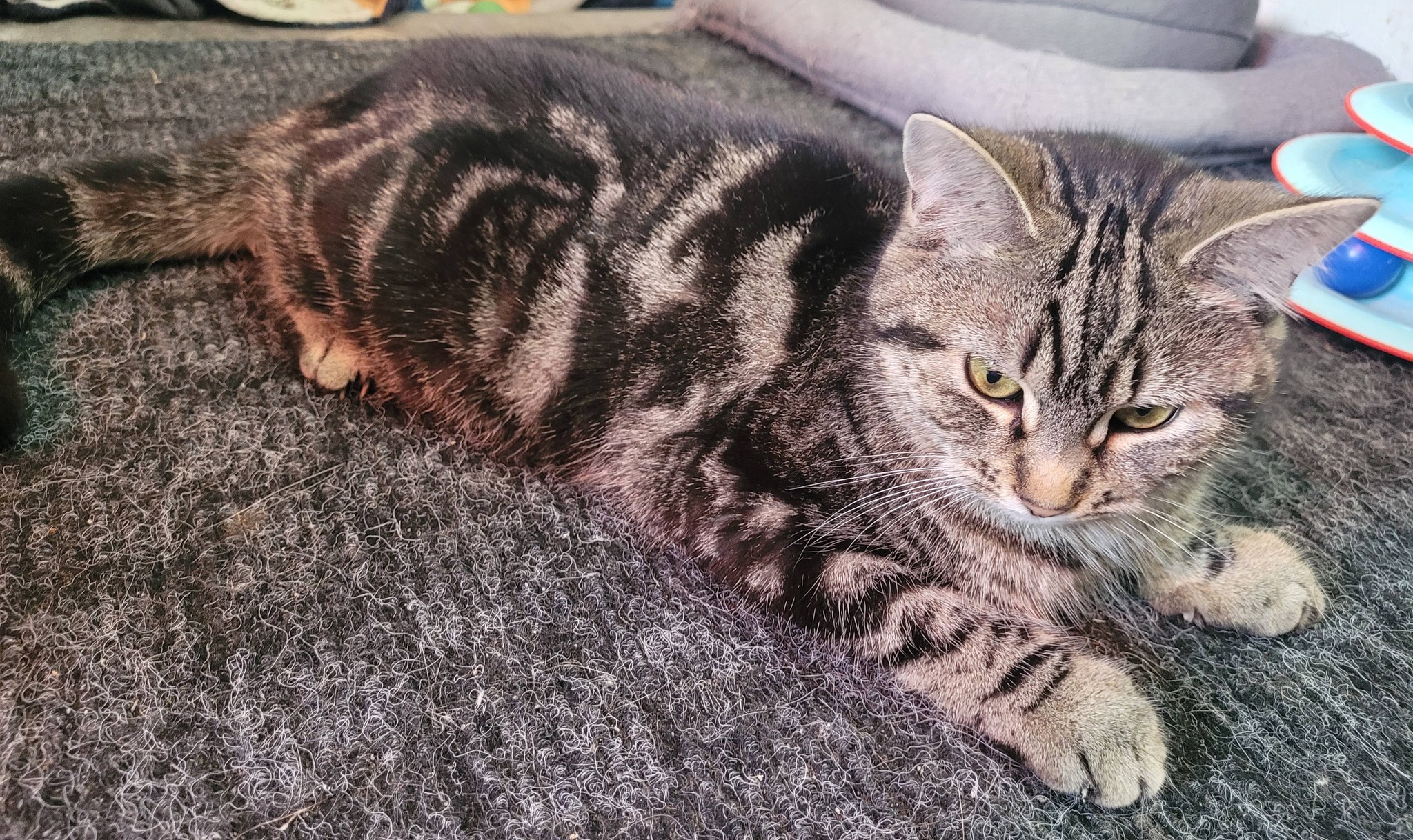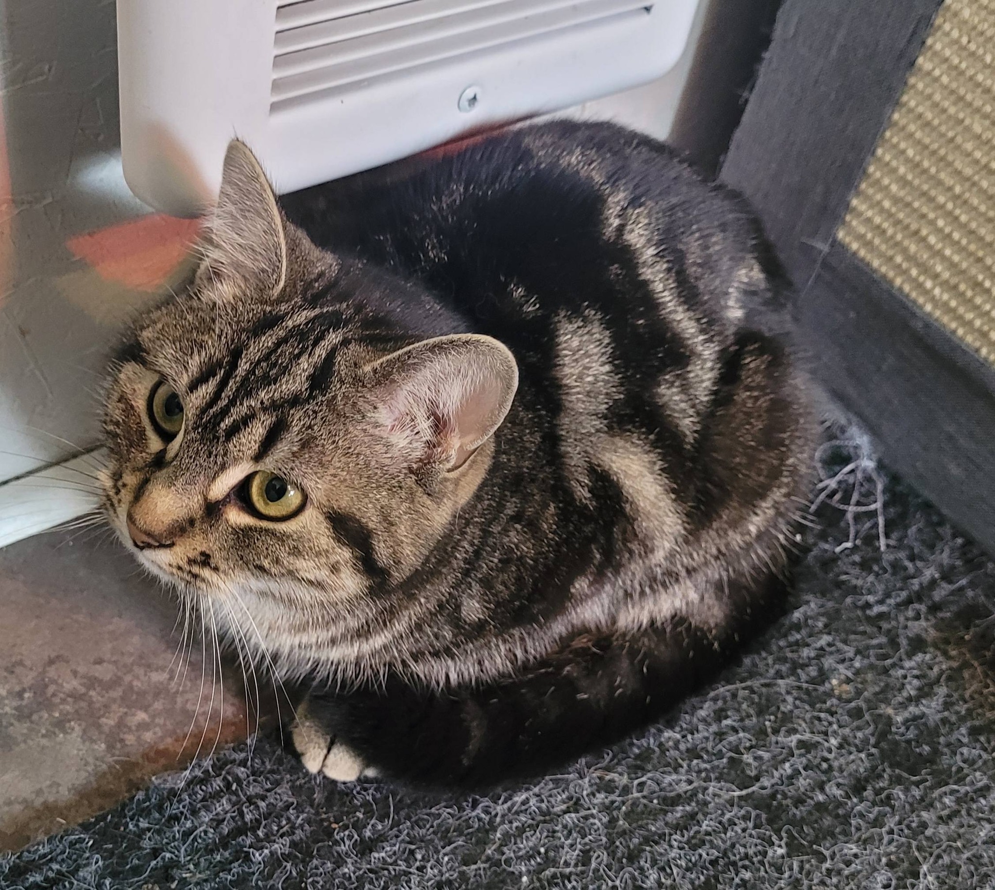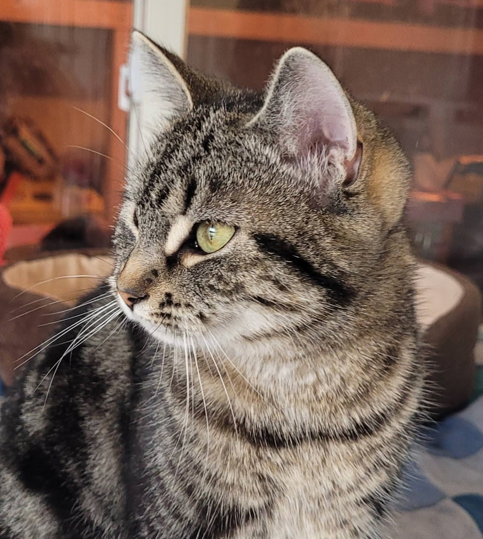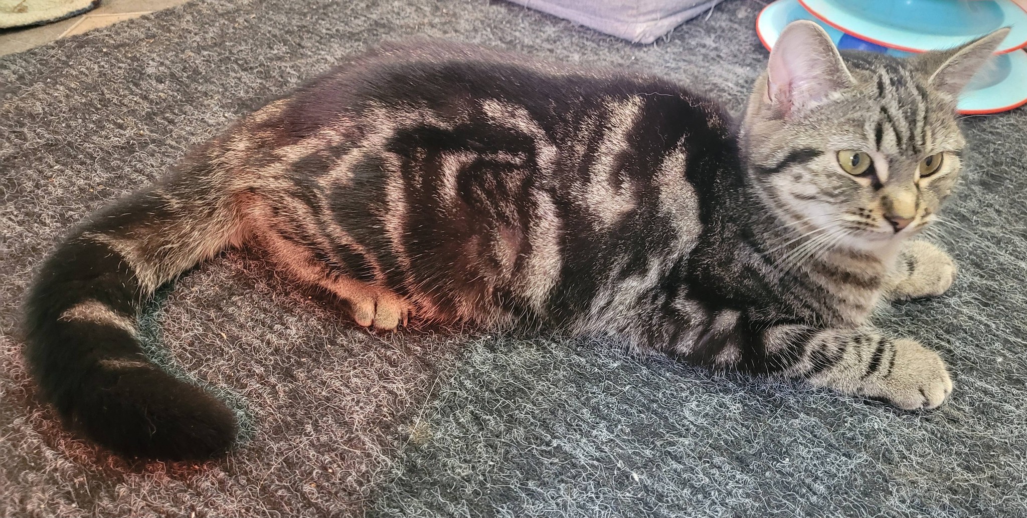 Lilia est tabby noir avec un magnifique pelage et son poil est très soyeux. Elle a de magnifiques yeux jaunes. Elle est en bonne santé.