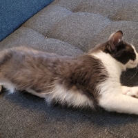 Très curieuse de l’extérieur, elle pourrait probablement devenir une excellente chatte à promener en harnais. Quoi qu’elle fasse, elle est incroyablement mignonne, ressemblant à une grande boule de poils. Récemment, elle a commencé à apprécier les caresses, et elle a même émis ses premiers ronronnements. Elle se laisse déjà prendre dans les bras et y reste calmement. Pourtant, on la trouve souvent proche de ses frères et sœurs, dormant ensemble ou planifiant leurs prochaines bêtises.