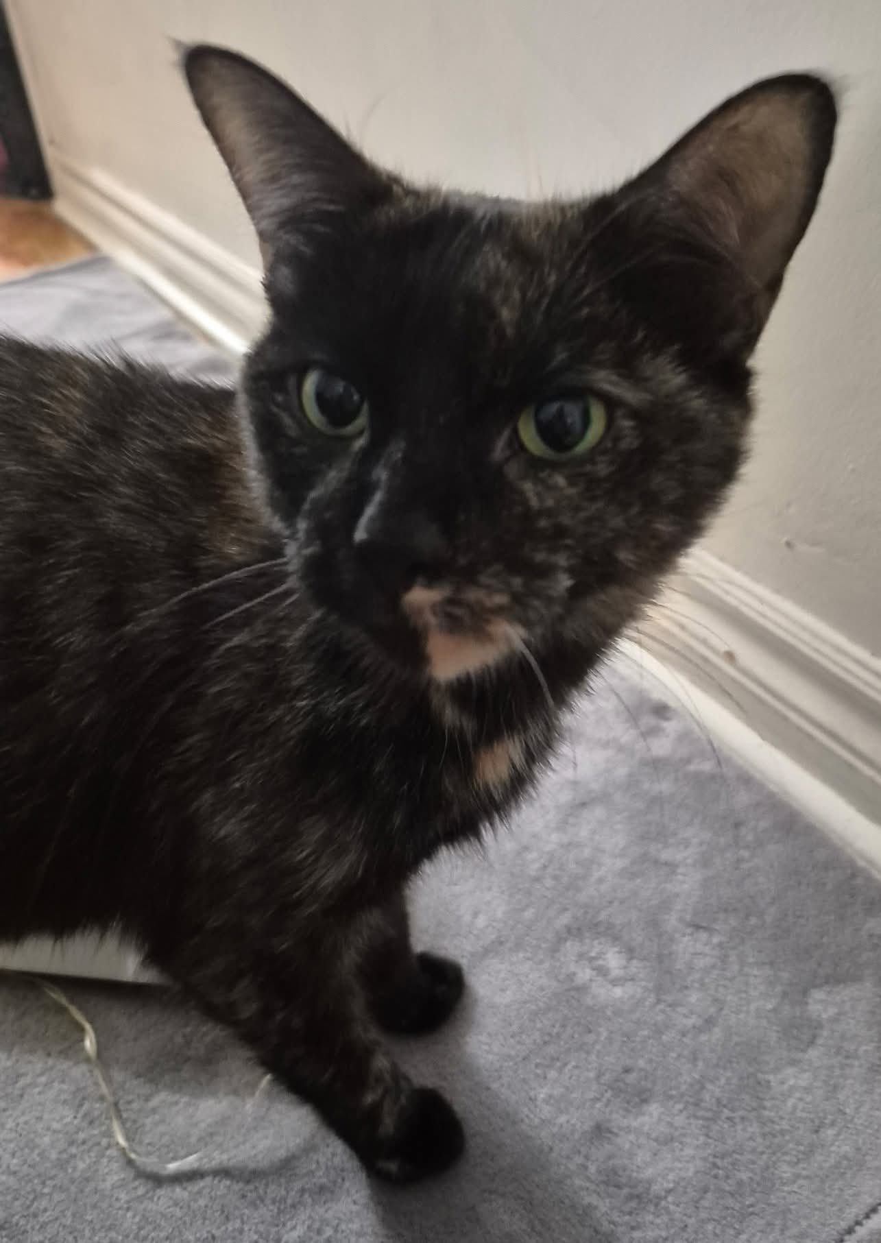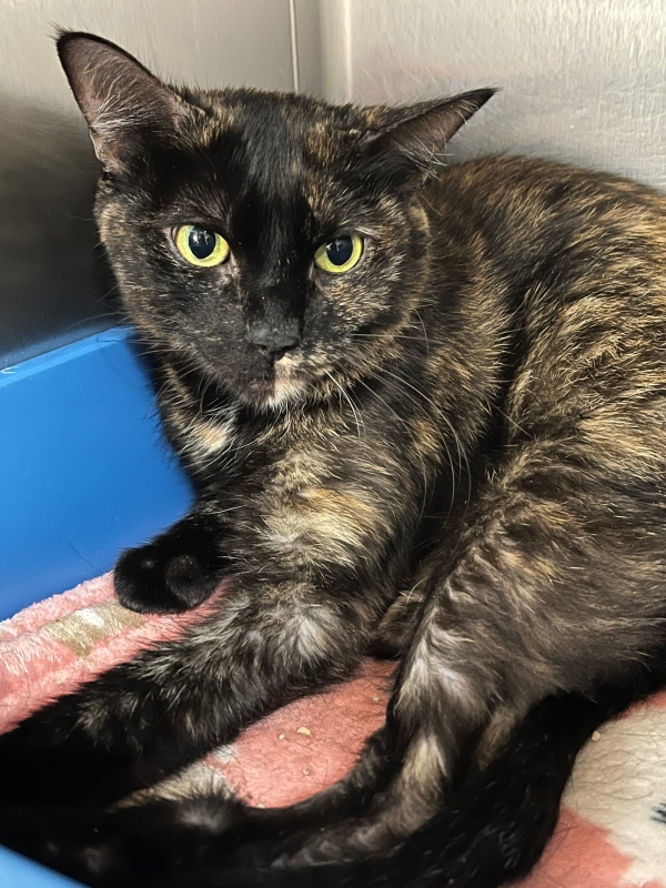 Lilly présente un magnifique pelage écaille de tortue dense et lustré et de fascinants yeux verts au regard captivant mais inquiet qui vous atteint directement au coeur. Elle est en excellente santé. Nous voulons maintenant offrir à cette grande beauté une famille dévouée et aimante pour lui assurer le plus bel avenir possible.