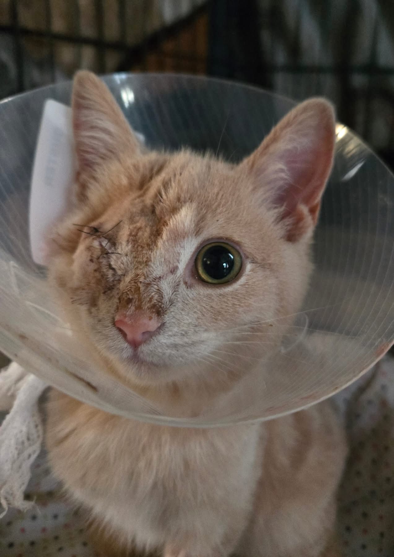 Il a été hospitalisé afin qu’il survive et des traitements ont été faits pour sauver son oeil. Malheureusement, son oeil a dû être retiré. Lou fait maintenant un clin d’oeil perpétuel.