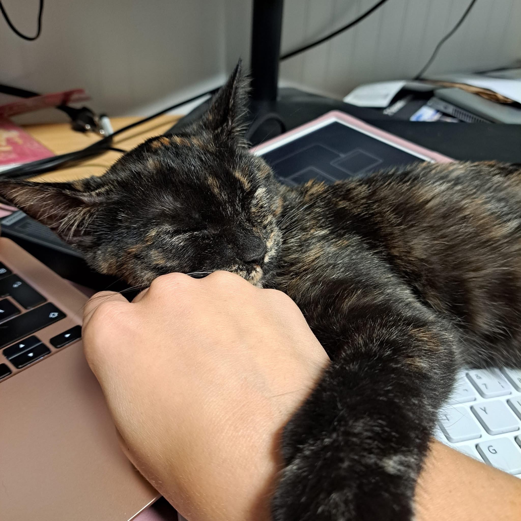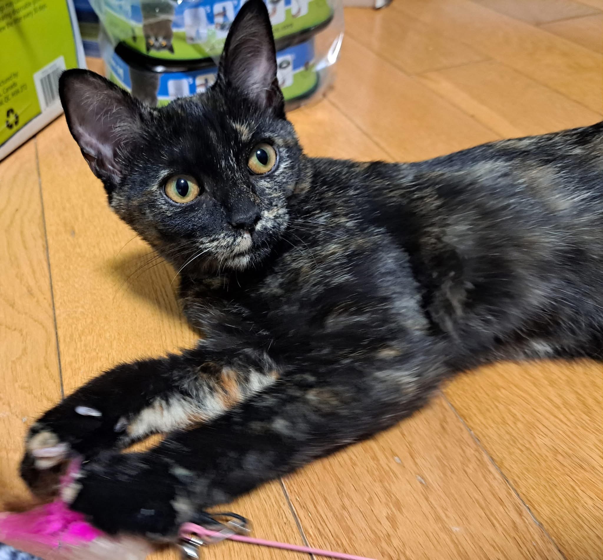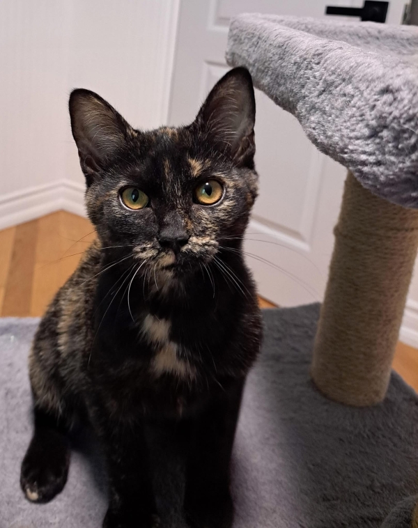 Une craquante jeune femelle écaille de tortue âgée de 5 mois  (née le 26 avril 2025).