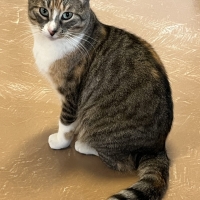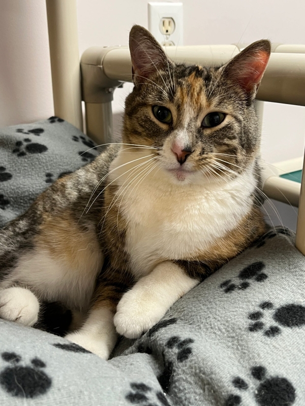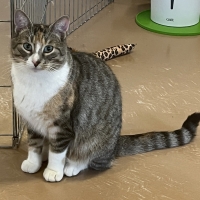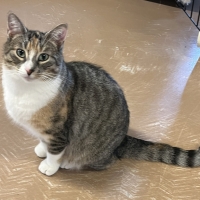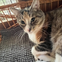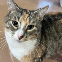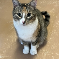 Si vous êtes attirés par les jolies chattes aux incroyables yeux verts expressifs, au magnifique pelage bigarré (un mélange de tabby et calico) et possédant une personnalité tendre et attachante, Martine saura alors vous plaire à coup sûr. Cette gentille féline au regard triste et inquiet, aux belles pattes blanches et au irrésistible nez rose et noir, est en excellente santé.