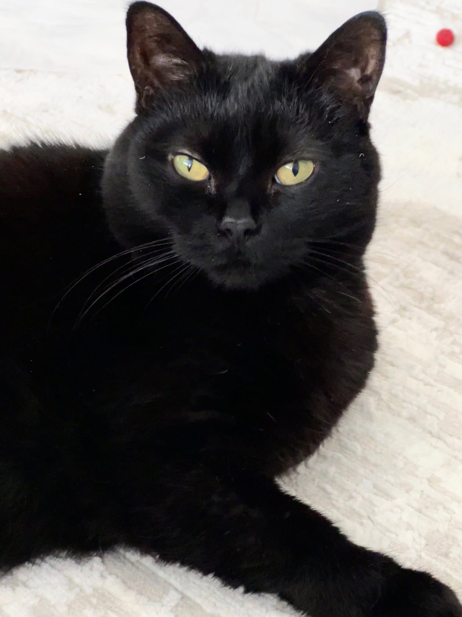 Mihaela ressemble à une petite panthère avec son beau pelage noir parsemé de quelques poils blancs et ses grand yeux dorés inquisiteurs. Cette beauté vous enchantera aussi grâce à sa personnalité affectueuse et engageante.