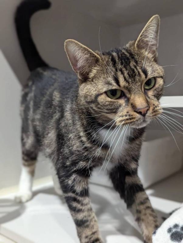 Mikoto est une petite minette qui nous a été apportée après avoir été retrouvée dans un logement insalubre abandonné par son propriétaire. À son arrivée, ses tétines étaient pleines de lait, mais aucun chaton n’a été trouvé sur place 🙁