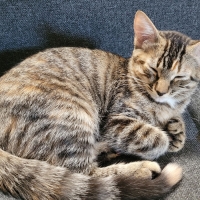 Elle se laisse facilement prendre dans les bras et adore tous les moments de câlins. Mila apprécie également les moments de jeu, chassant les plumes et les lasers avec autant d’enthousiasme que ses frères et sœurs. On la trouve souvent proche de ses frères et sœurs, dormant ensemble ou planifiant leurs prochaines bêtises. Elle cherche une famille présente et attentionnée, mais elle préférerait un foyer sans jeunes enfants, en raison d’un caractère un peu craintif.