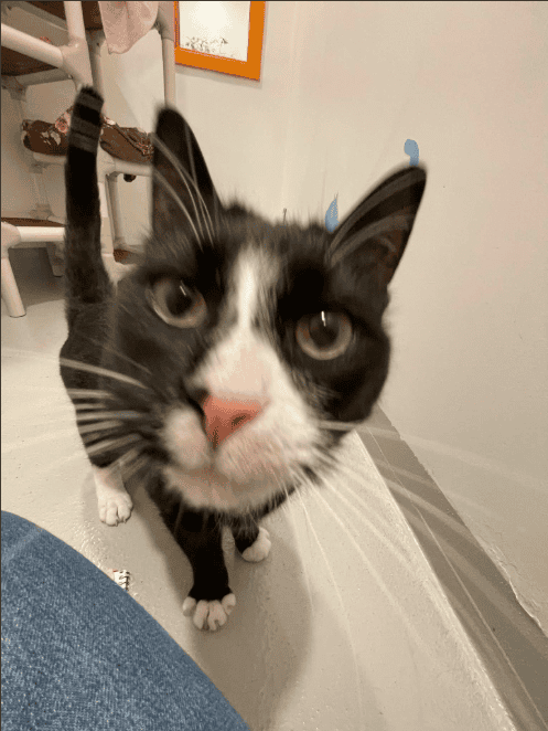 « Je suis un magnifique minou noir et blanc et, comme mon nom l’indique, j’adore les minouches! Mais ce que j’aime par-dessus tout, c’est me coller et me faire flatter.