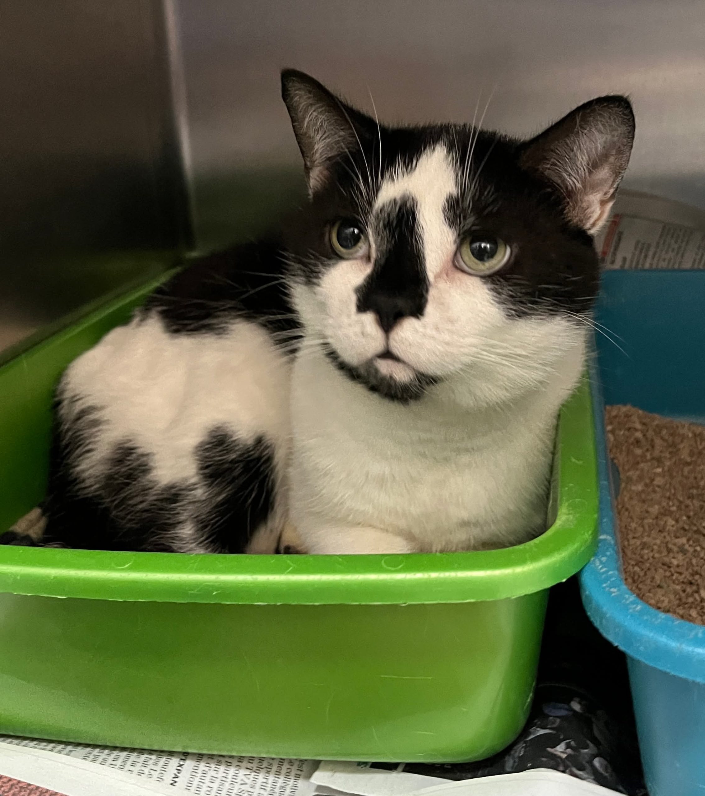 Mittens est une ravissante chatte au doux pelage blanc et noir, aux incroyables yeux verts pâles remplies de tristesse et d’intelligence et au petit museau aux marquages tellement adorables. Son charme est indéniable – il ne suffit que de quelques instants avec elle pour en tomber follement en amour! Cette beauté est en très bonne santé.