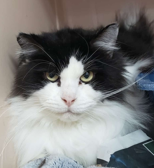 Momo est un mâle noir et blanc au poil long de 1 an.