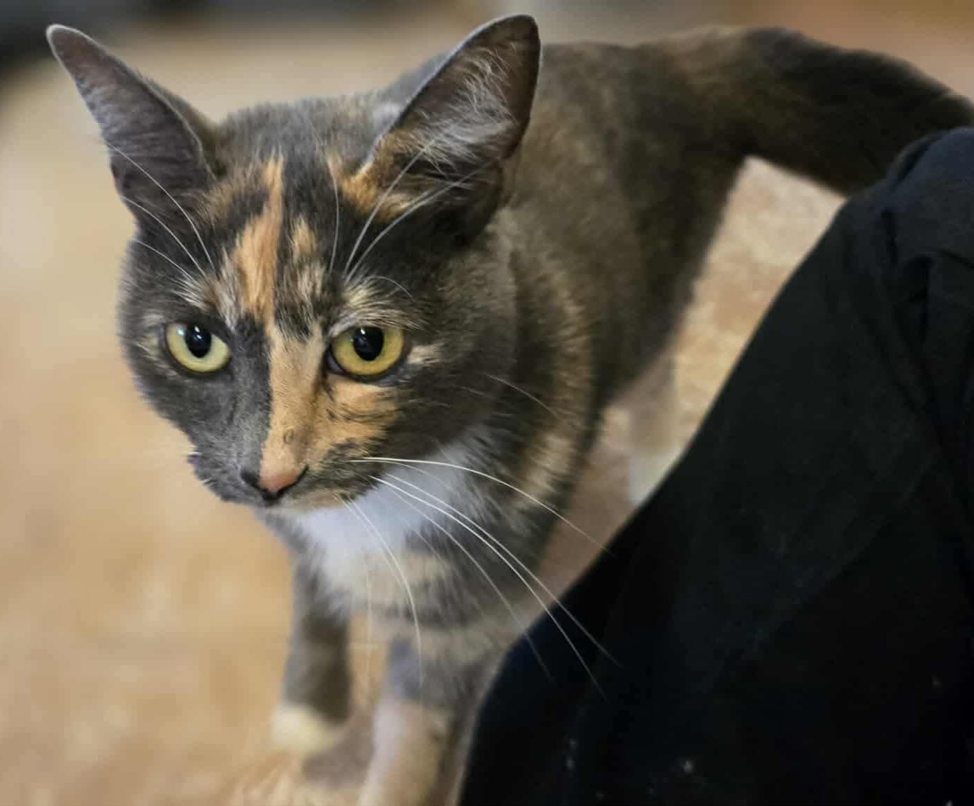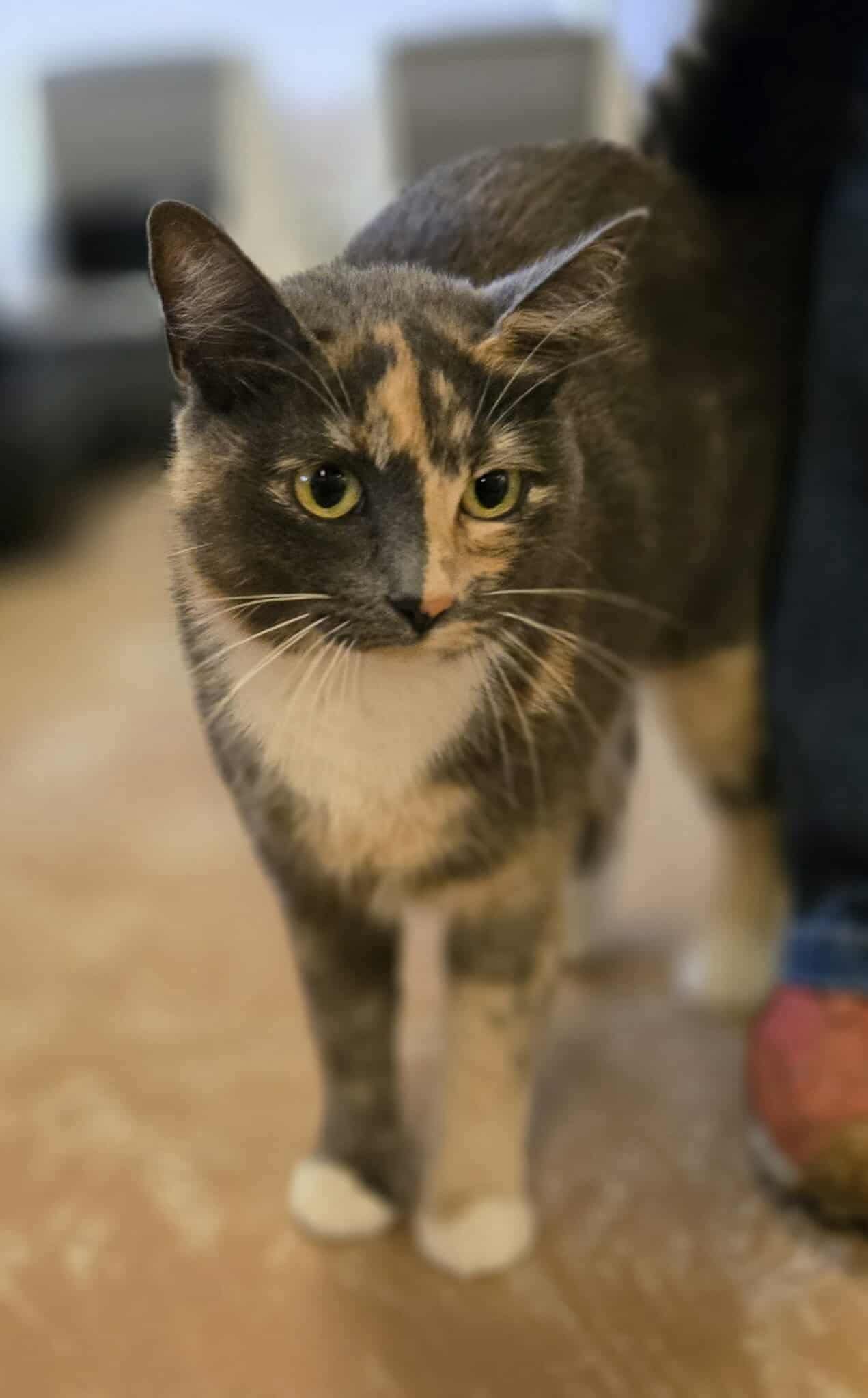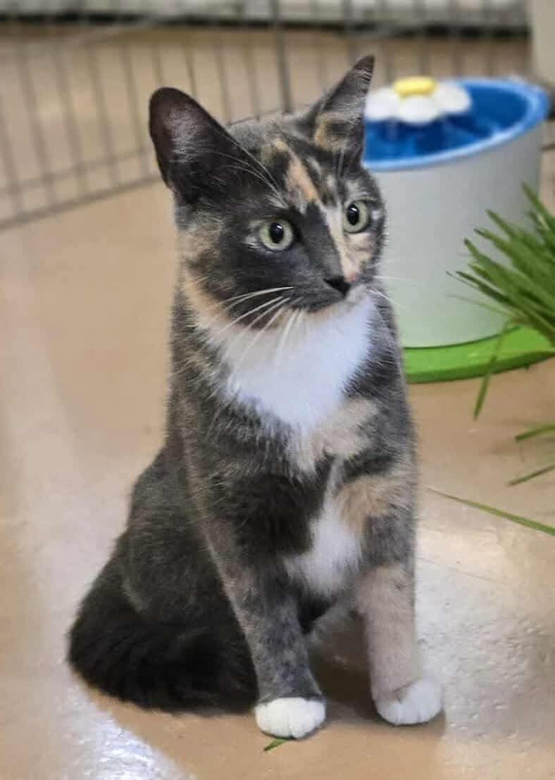 Moon est une chatte des plus attrayantes avec son élégant pelage calico dilué et ses sublimes et grands yeux verts-dorés au regard rempli d’intelligence et de vivacité. Elle est en excellente santé.
