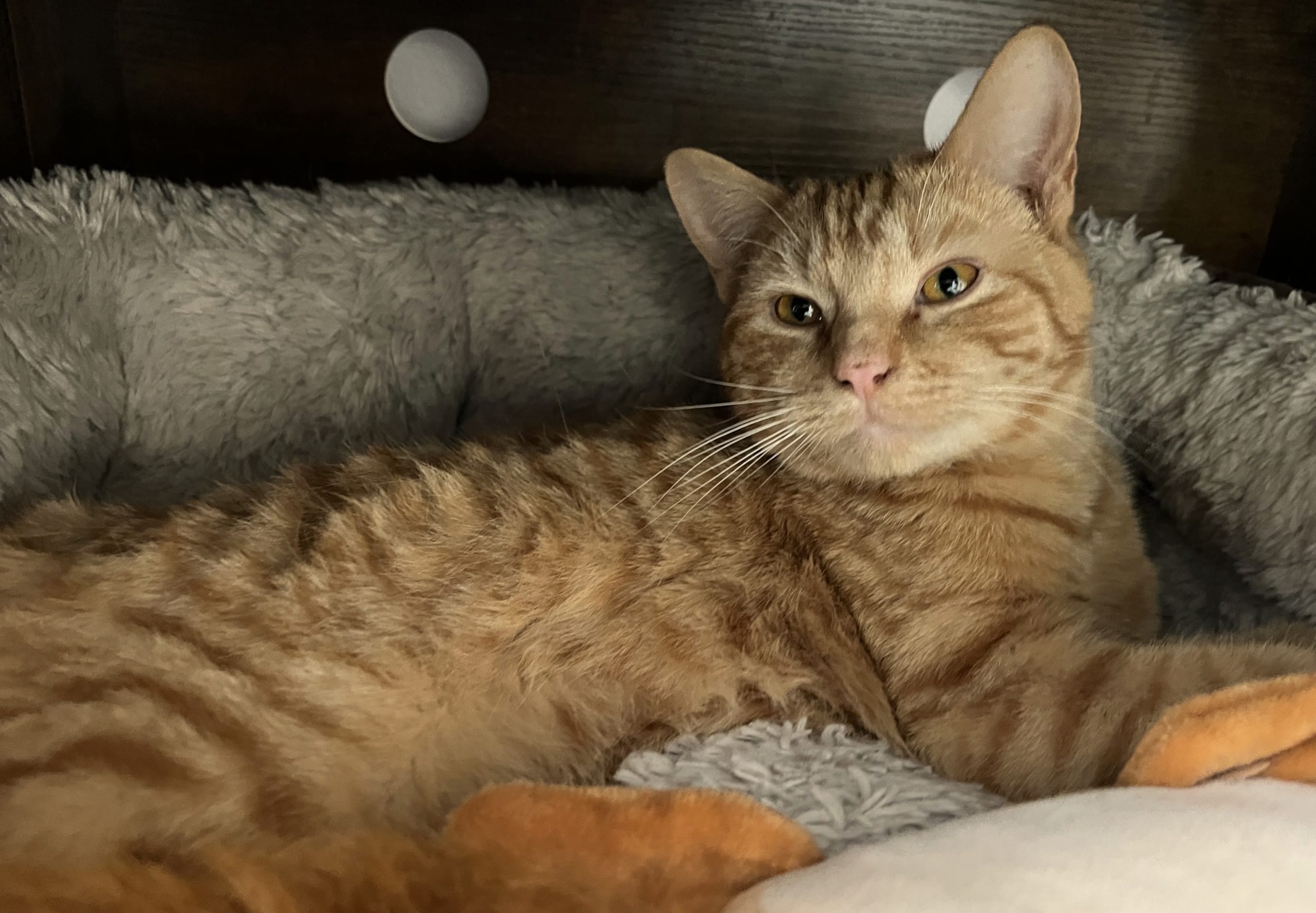 Maintenant dans la salle commune avec une vingtaine d’autres chats attendant leur adoption, Nash & Neko sont souvent couchés ensemble – voir entrelacés – pour faire la sieste mais se montrent de plus en plus curieux et se promènent pacifiquement pour interagir avec leur colocataires félins. Ils mangent avec appétit, utilisent les litières sans problème et sont en très bonne santé, tel que confirmé par notre vétérinaire.