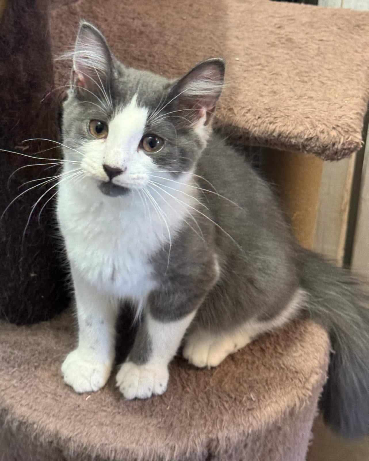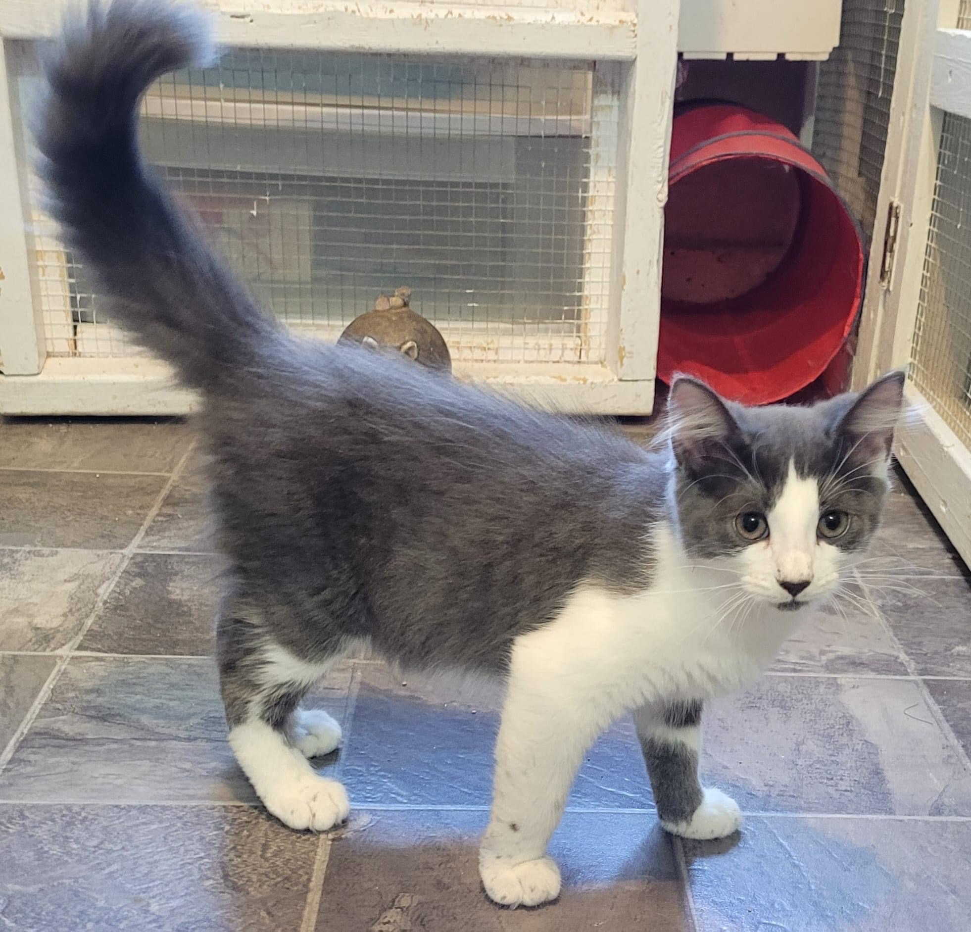 Obélix est un splendide chaton gris et blanc à poil mi-long.