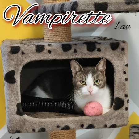 Une jeune minette d’un an à la recherche de sa famille adoptive. Elle présente un niveau d’énergie élevé. Elle a été sortie de l’errance avec de grosse masses mammaires douloureuses qui devaient être retirées.