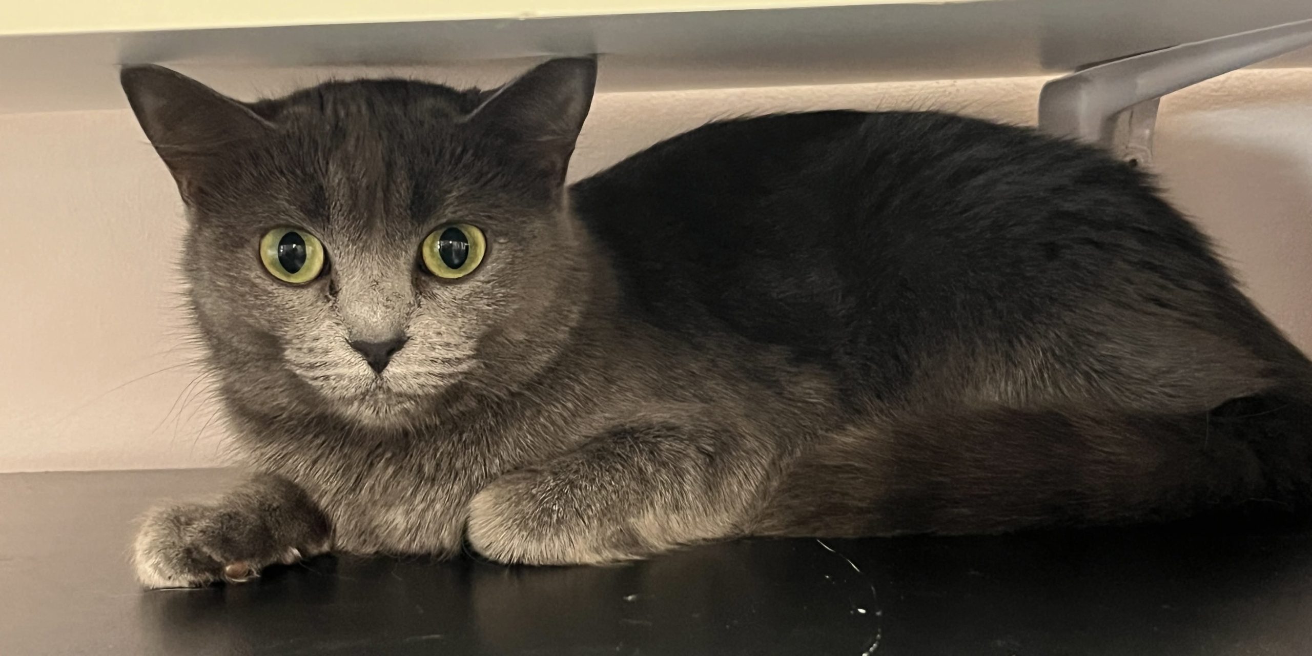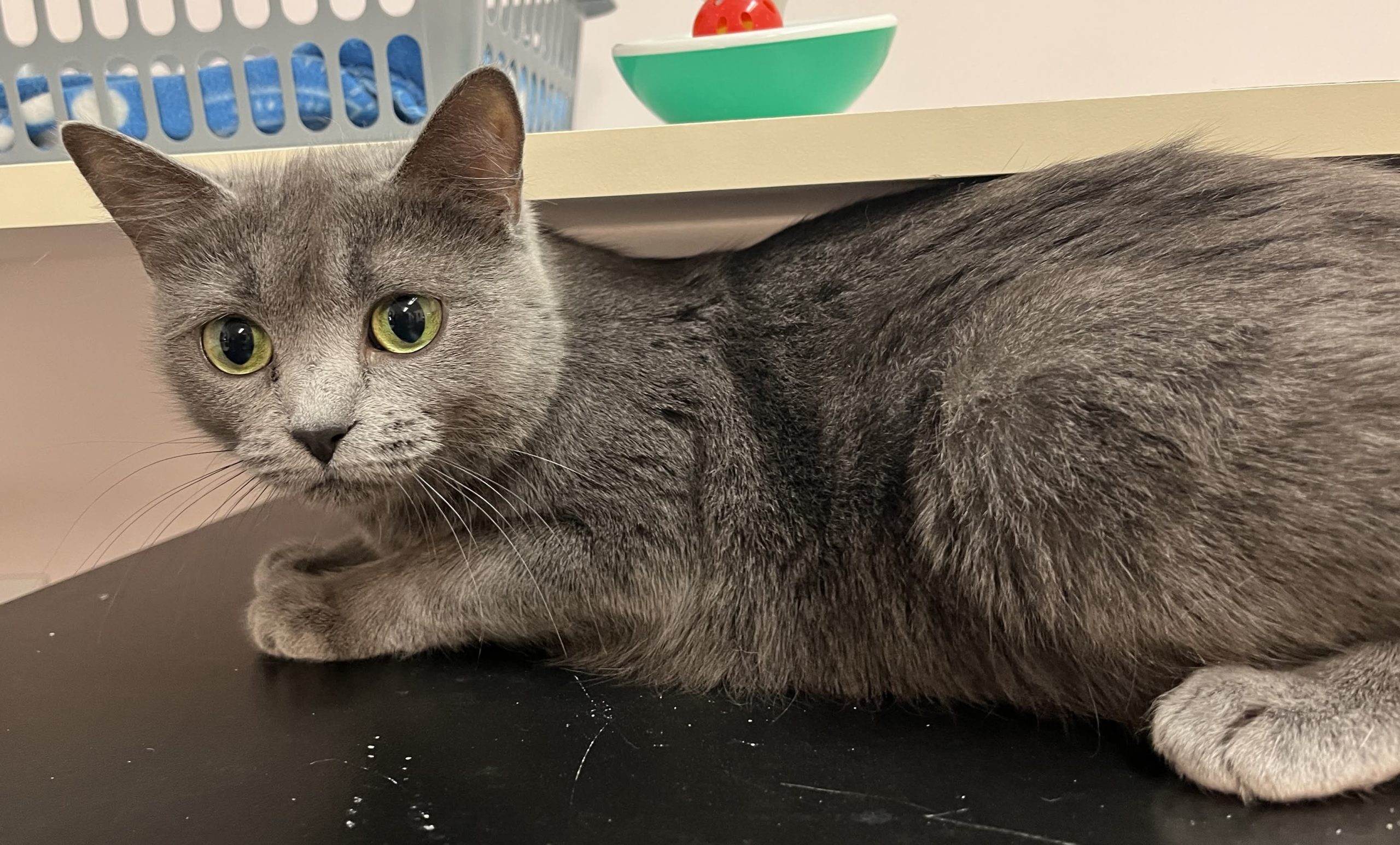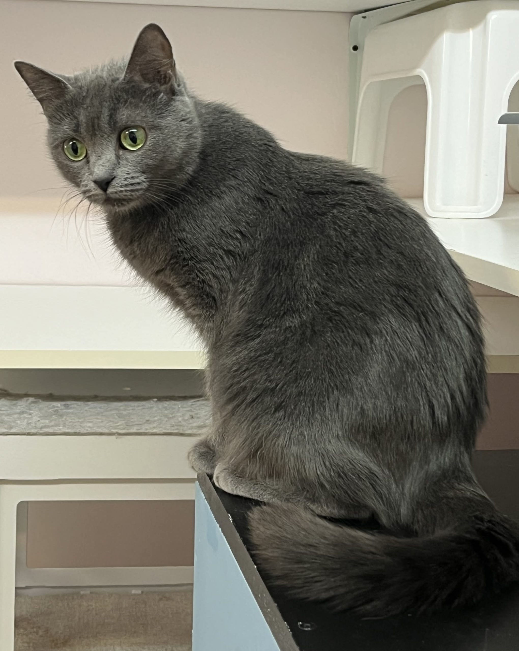 Pookie est une délicate petite chatte très chouette avec un ravissant pelage gris-bleu et aux immenses yeux verts émeraude empreints de curiosité mais aussi de beaucoup d’inquiétude. En très bonne santé, elle ressemble beaucoup aux chats de race Chartreux. On dirait qu’elle est presqu’un chaton tellement elle est menue.